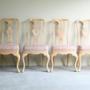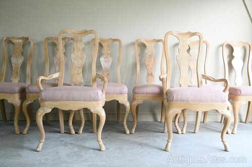Set 8 Drexel Heritage Limed Ash Queen Anne Style Dining Chairs. Set 6 chairs + 2 carvers, limed ash frame with pink linen seatDimensions: Carver 59cm wide x 49cm deep x 51cm seat height x 109cm high // chairs are 54cm wide