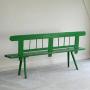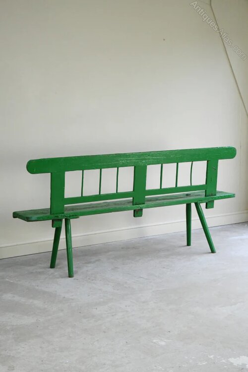 Antique Green Painted Pine European Bench. Single 19th century painted pine bench, simple rustic form, the back rail on turned supports and single plank seat on splayed legs. A European bench, possibly Austrian, with an attractive surface patina and folk quality. Two availableDimensions: 191cm wide x 31cm deep x 47cm seat height x 90cm high back