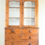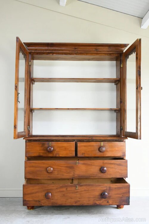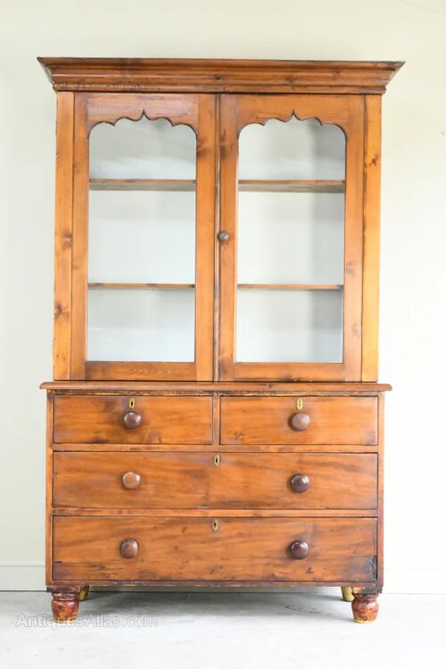 Antique Stained Pine Glazed Dresser. 19th century pine dresser cabinet, of useful proportions and good country character. The upper section is fitted with a pair of glazed doors enclosing adjustable shelving for display. The base is arranged with two short drawers over two long drawers, retaining turned wooden knob handles and brass escutcheons. Raised on short turned feet, the cabinet has a warm, well-aged patina throughout, with attractive colour and grain to the pine. A practical and decorative piece, ideal for use as a kitchen dresser, display cabinet, or storage cupboard in a dining room or hallway.Dimensions: 130cm wide x 47cm deep x 39cm deep cornice x 25.5cm deep shelves x 197cm total height x 84cm high base