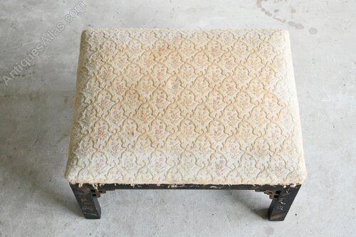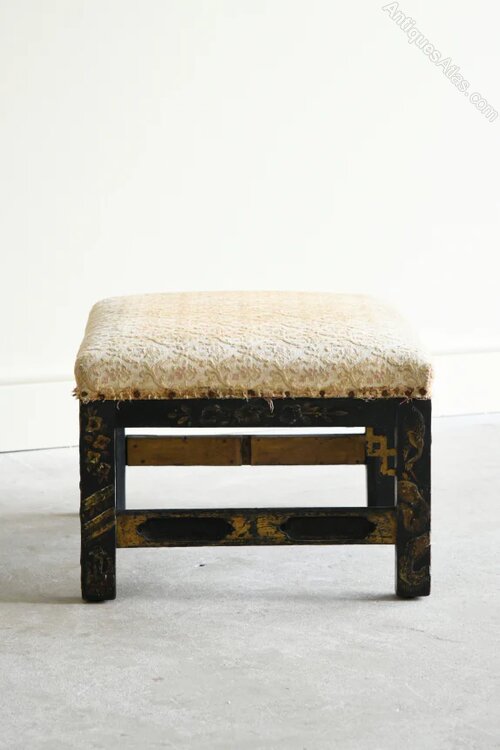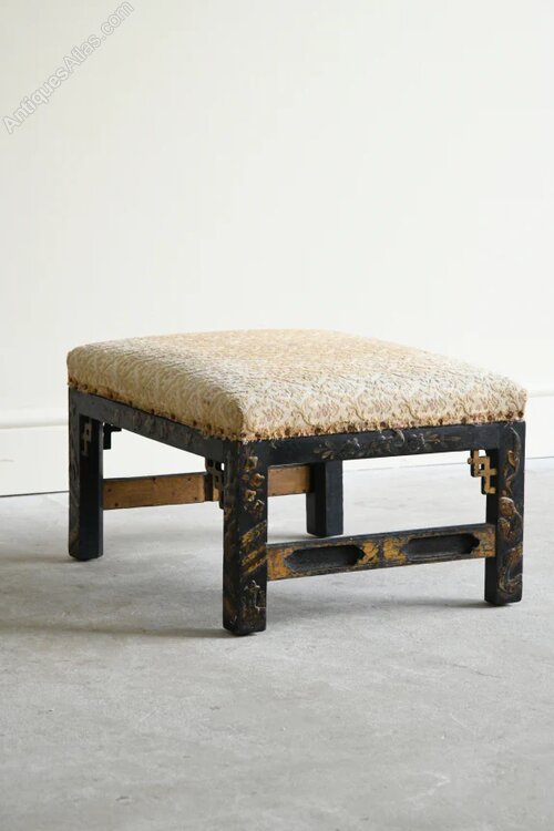 Chinese Chippendale Style Low Stool. Early 20th Century low stool in the Chinese Chippendale style, with a black lacquered frame highlighted by gilt painted detail. Traces of original painted decoration remain visible, giving the piece attractive age-related character. Compact and versatile.Dimensions: 37cm wide x 47cm deep x 27cm high