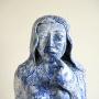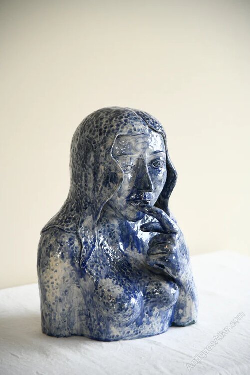 Contemporary Pottery Bust. A late 20th century studio pottery bust by Richard Tindale, depicting a female figure in a thoughtful pose, hand raised gently to her lips. The sculpture is expressive and characterful, with strong facial modelling and a contemplative presence. Finished in a richly textured blue glaze with mottled tonal variation, the surface enhances the sculptural detail and gives the piece depth and movement.Dimensions: 28cm x 19cm x 36cm high