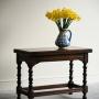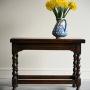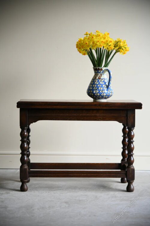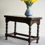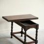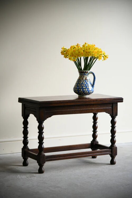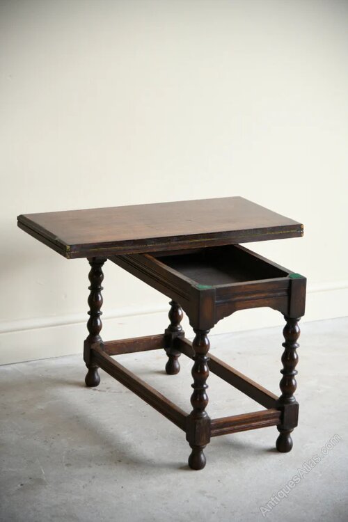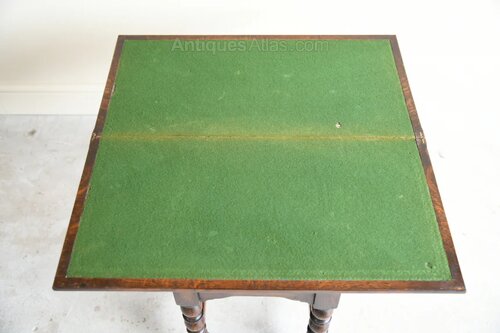 Small oak games table. Early - Mid 20th Century oak side table of late 17th century revival design, featuring a rectangular turnover top with baize lining, raised on four well-turned baluster legs united by peripheral stretchers. The proportions make it a versatile piece — ideal as a lamp table, side table or occasional table.Dimensions: 66cm wide x 33cm x 49cm high x 66cm when open
