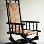 Ebonised & Rush American Style Rocking Chair. Late 19th to early 20th century rocking chair featuring an ebonised frame with turned spindle supports and shaped rockers. Traditional woven rush seat and back, arranged in a classic V-pattern, providing both comfort and strong visual contrast against the dark painted timber. An attractive and versatile occasional chair, ideal for a hallway, sitting room or bedroom setting.Dimensions: 55cm wide x 66cm deep x 38cm seat height x 58cm arm height x 110cm high back