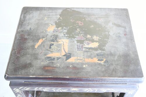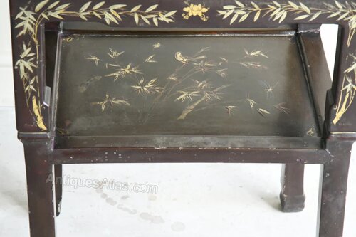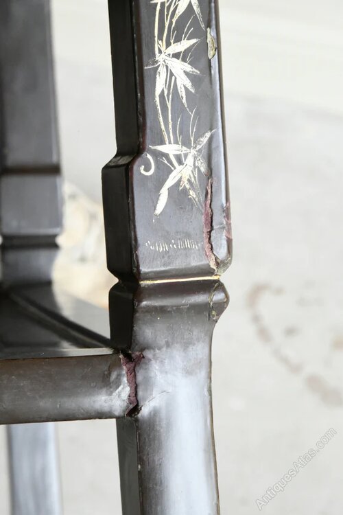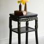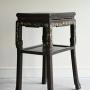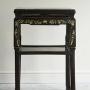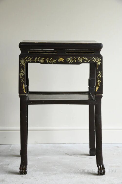 Chinese Plant Stand. Decortive late 19th century Chinese hardwood plant stand, finished in a rich dark lacquer. The square top with stylised arrangement of vessels, floral sprays, and symbolic objects , decorative frieze featuring delicate gilt bamboo and foliate decoration . The stand is raised on four square-section legs, joined by a lower tier for additional display.Dimensions: 34cm x 45cm x 71cm high
