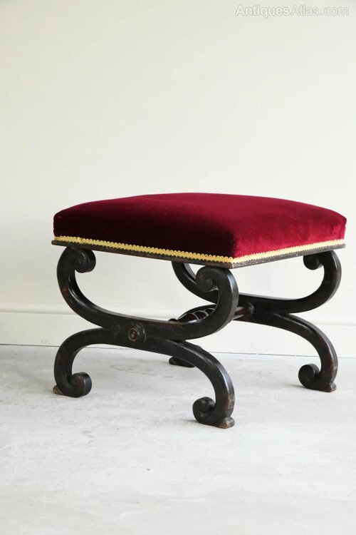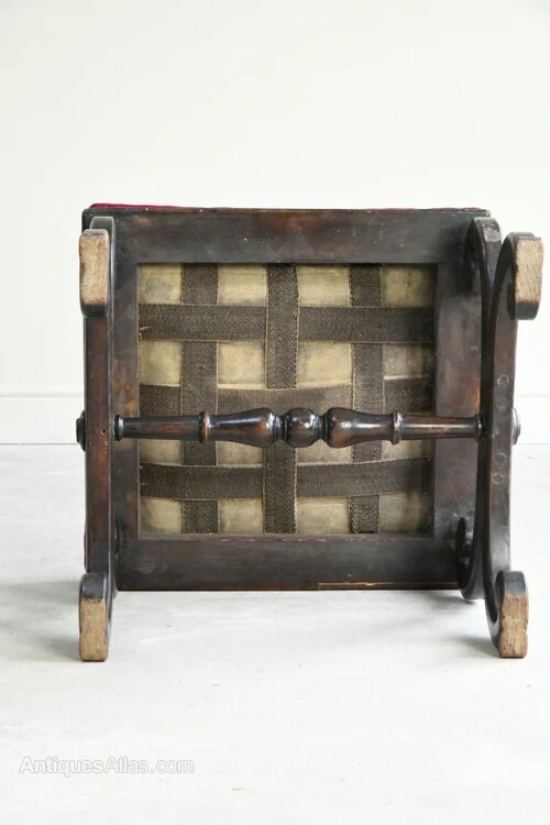 Antique Savonarola Style Stool. 19th century Savonarola style stool with bold scrolled X-frame supports and central turned stretcher. Dark stained hardwood frame, webbed and upholstered seat. A decorative and practical piece, ideal as occasional seating or a statement accent in both traditional and eclectic interiors.Dimensions: 51cm x 54cm x 47cm high
