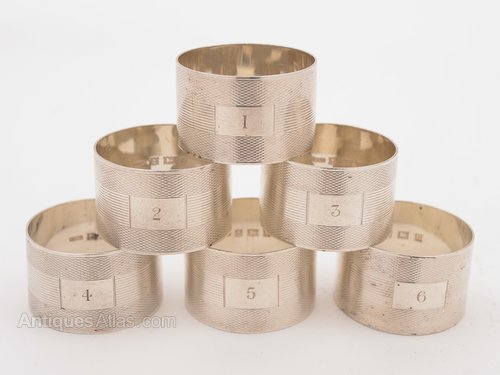 A good set of 6 vintage silver napkin rings numbered 1-6 with engine turned decoration. Hallmarked Birmingham 1956 and marked 'D Bros' for Dingley Brothers.FREE worldwide delivery.