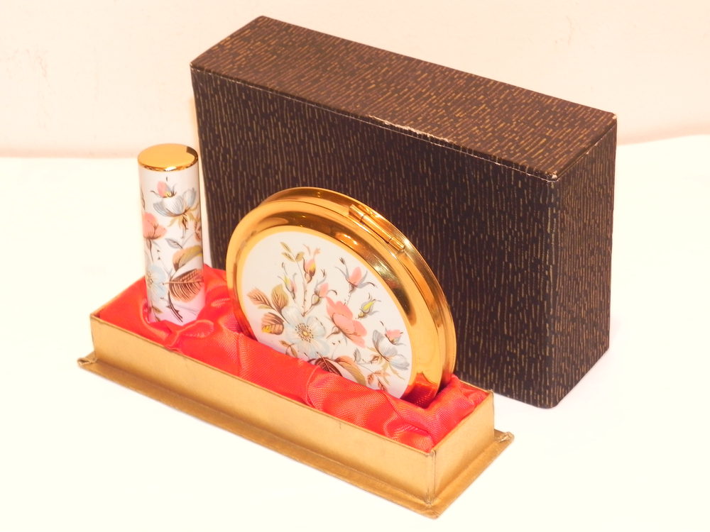Stunning! In absolutely MINT unused condition, this wonderful floral bouquet, powder compact & lipstick case set all carefully preserved in its original silk lined presentation case is an absolute delight. This is a collector's dream and will certainly not disappoint! - I think it will have been given as a gift , immaculate the beautiful high polish enamel finished top is adorable with subtle shades, it is beautiful. - Don't miss this one!.Date1950s :