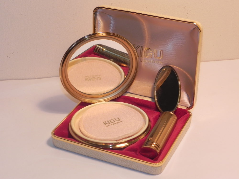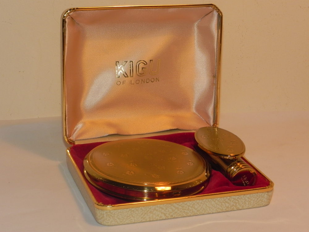 Immaculate, unused and carefully preserved with its original hard cased, silk & red velvet lined KIGU signed box - this beautiful 1950's Gift Set powder compact and matching lipstick will delight the most discerning of buyers - The powder compact, complete with its original signed puff and unused sifter is adorable, with a beautiful, simple and elegant flower design in gold (measuring 3" inch diameter all clasps and hinges perfect and mirror nice and clear). Impossible to find in such fabulous condition - The matching lipstick is also lovely - Superb and in the best of vintage condition, pretty and practical I am sure this will not disappoint and would make a fabulous vintage gift this Christmas.Date1950s :