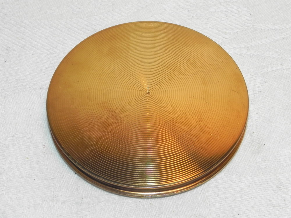 Beautiful and in the best of vintage condition, this little beauty has not been used. Measuring c. 3" inch diameter, an early piece by Stratton, all clasps and hinges are in super order, the wonderful enamel top is adorable set to a gold tone base. Internally it is immaculate and with a very unusual (I have only ever seen 1 before in 25 years!) puff signed Stratton with a crinoline lady - lovely, a black pouchette is also present, a very special piece that will not disappoint the most discerning of buyers!.Date1940s :