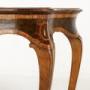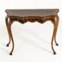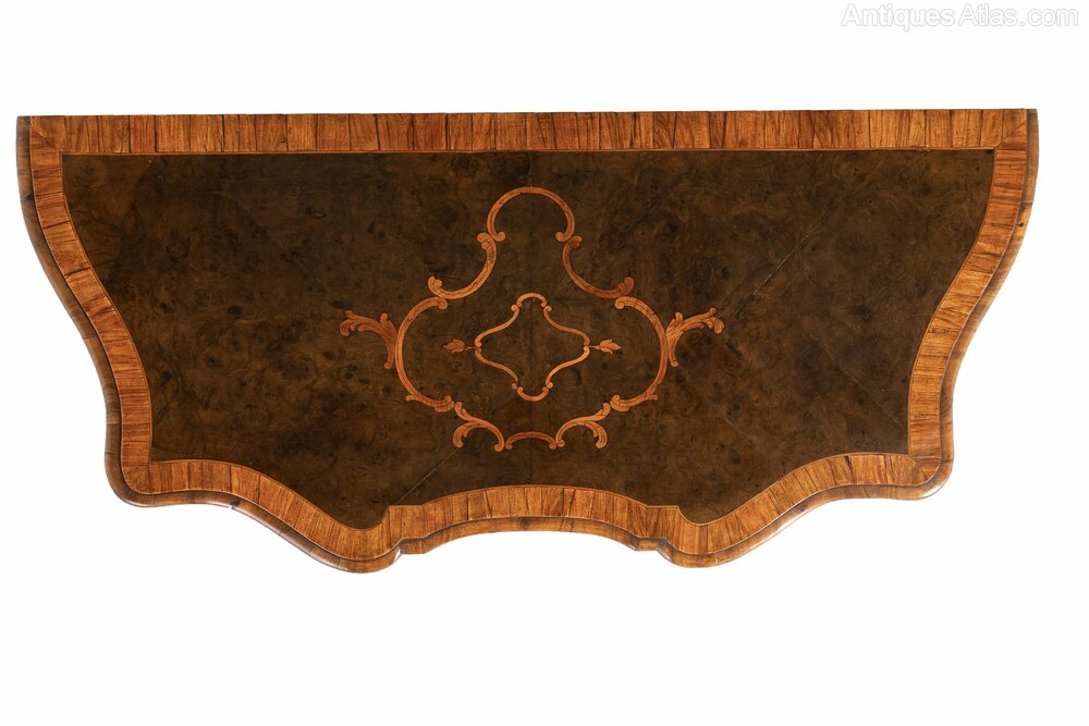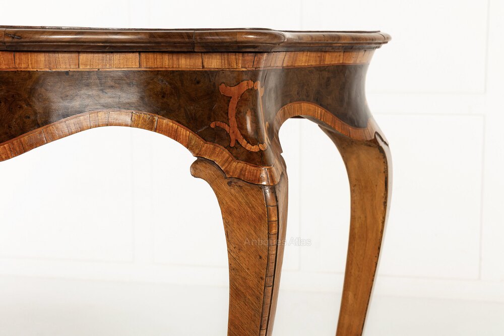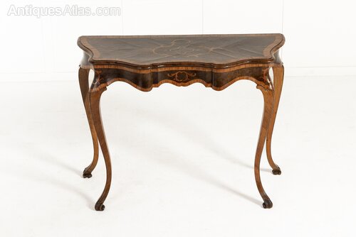 19th Century Italian Walnut Console or Side Table.This lovely table combines serpentine curves with fine veneers and inlay. The table frame is serpentine on every side except its back. The top and apron are veneered in dark patinated walnut. On the top the walnut veneers have been laid at an angle to create a parquetry effect. In the centre of the top and the frieze are inlaid cartouche motifs in contrasting lighter timber. The frieze and top are also widely crossbanded to create a further contrast between light and dark woods. The table stands on four cabriole legs with incurved feet.