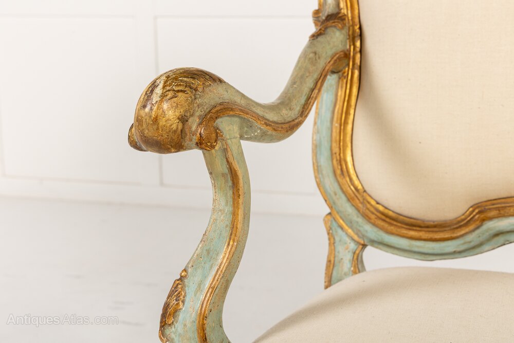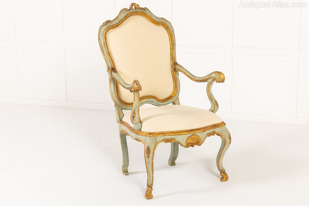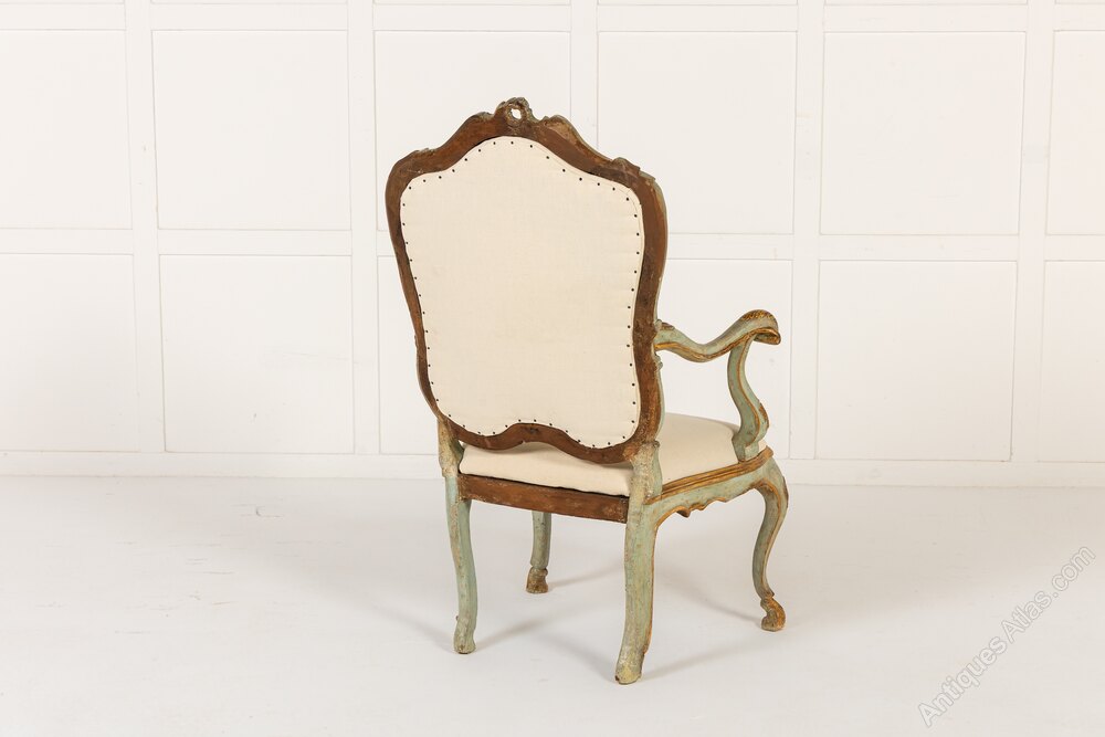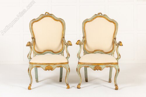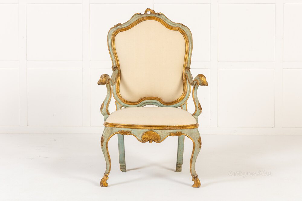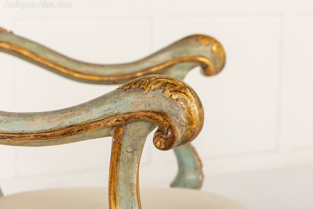 A Pair of 18th Century Italian Chairs with Original Blue and Gilt Paintwork.These lovely chairs are probably Venetian, made in the middle of the 18th century in the Louis XV rococo style. They retain their original blue paintwork, with gilded highlights. As would be expected with chairs of this period, the frames are made up of a series of curves and scrolls. The asymmetrical top rails vary on the two chairs, meaning that these are a true pair. The cresting leaning right on one chair, left on the other. The chairs are of grand and imposing scale but have soft curves to the frames and pretty soft blue painted finish.
