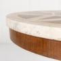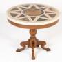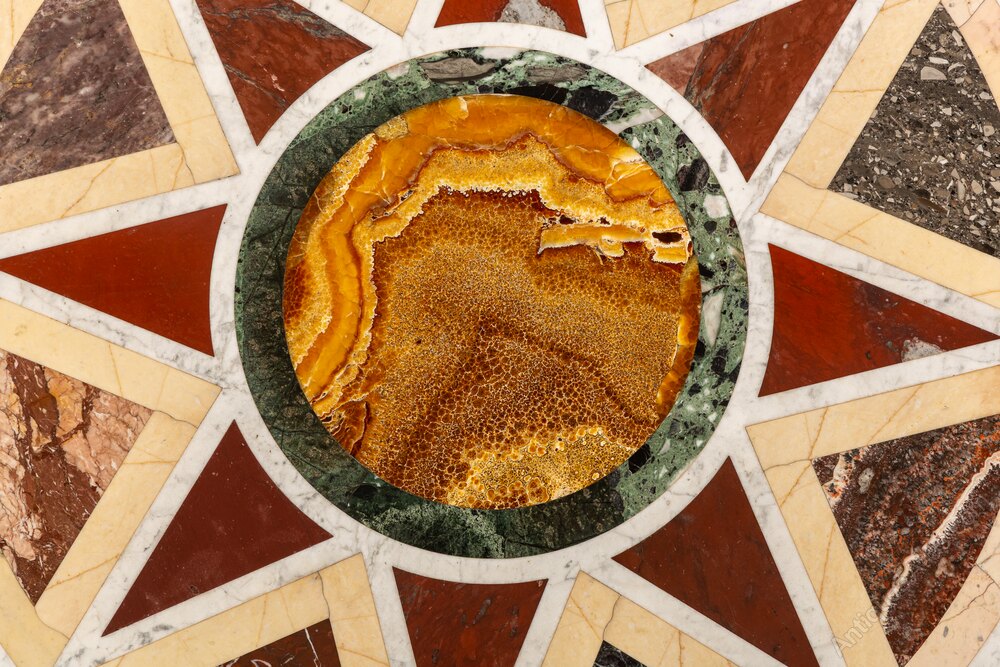 The deep circular top is inlaid with various coloured specimen marbles to create a sunburst geometric design arranged in a geometric starburst or radial pattern around a central circular motif. The individual marbles have been carefully chosen and matched to each other to create the most striking effect. Supported by a central baluster form column support and four unusually carved legs.