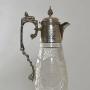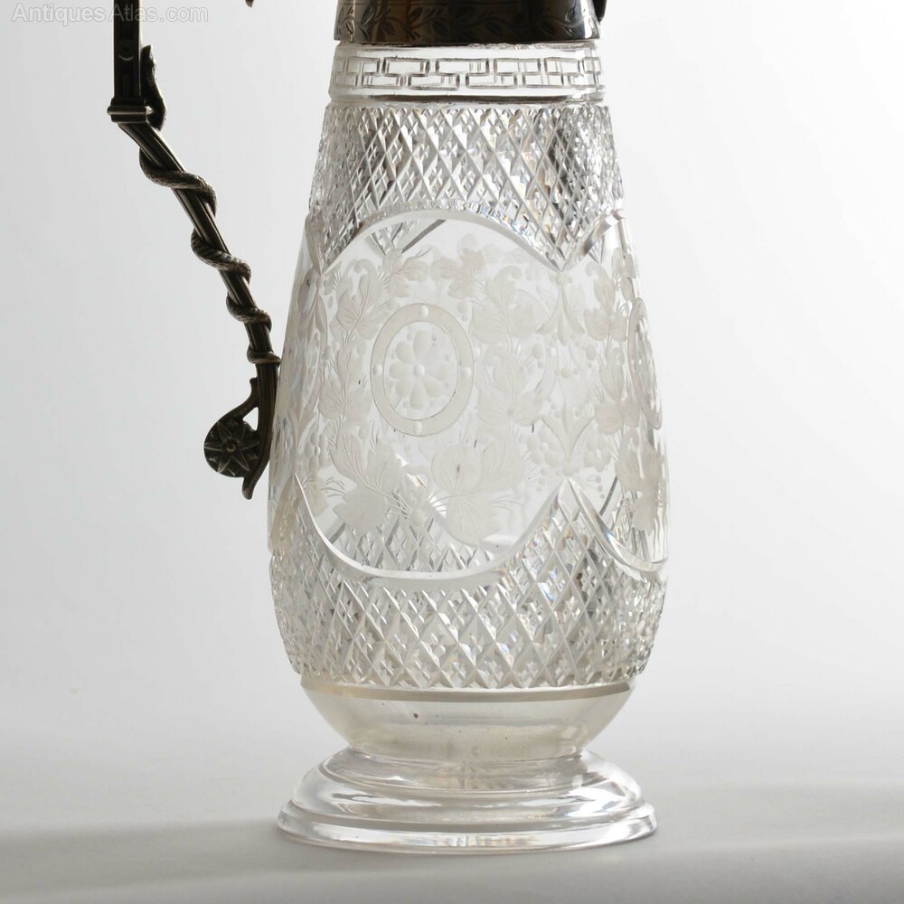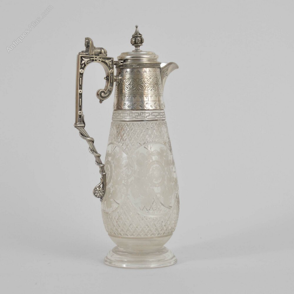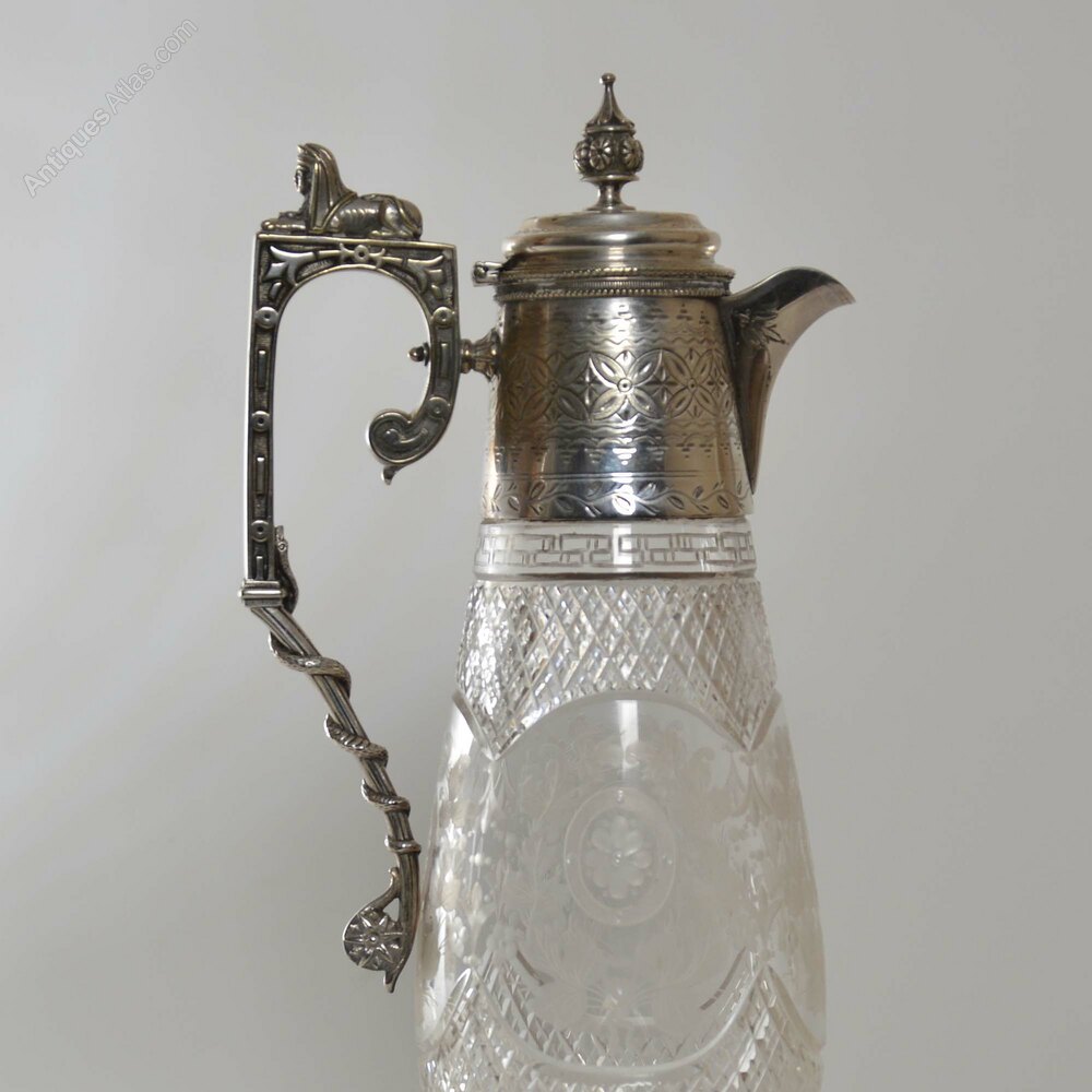 19th century silver plated claret jugClassic hobnail cut jug of low baluster form on raised domed foot with engraved Greek key pattern to neck. Floral and leafed wreaths to the body. Elaborately cast square cut handle with entwined serpent and sphinx to the thumb piece. Bright cut decoration to neck and spout with beaded borders to hinged lid with flower and petal decorated finial.
