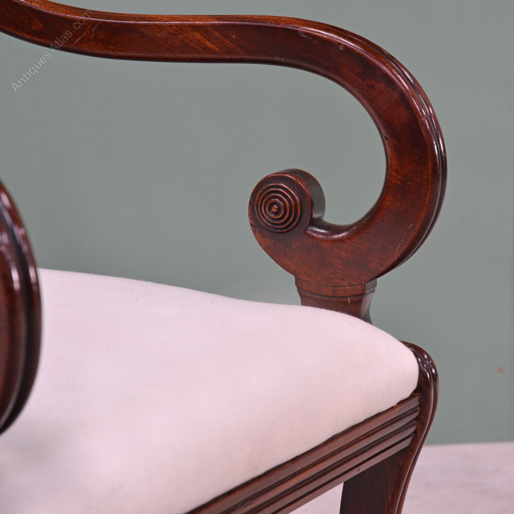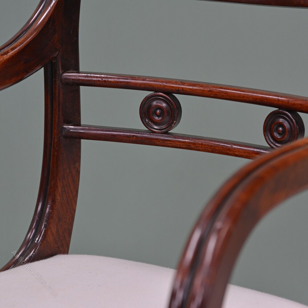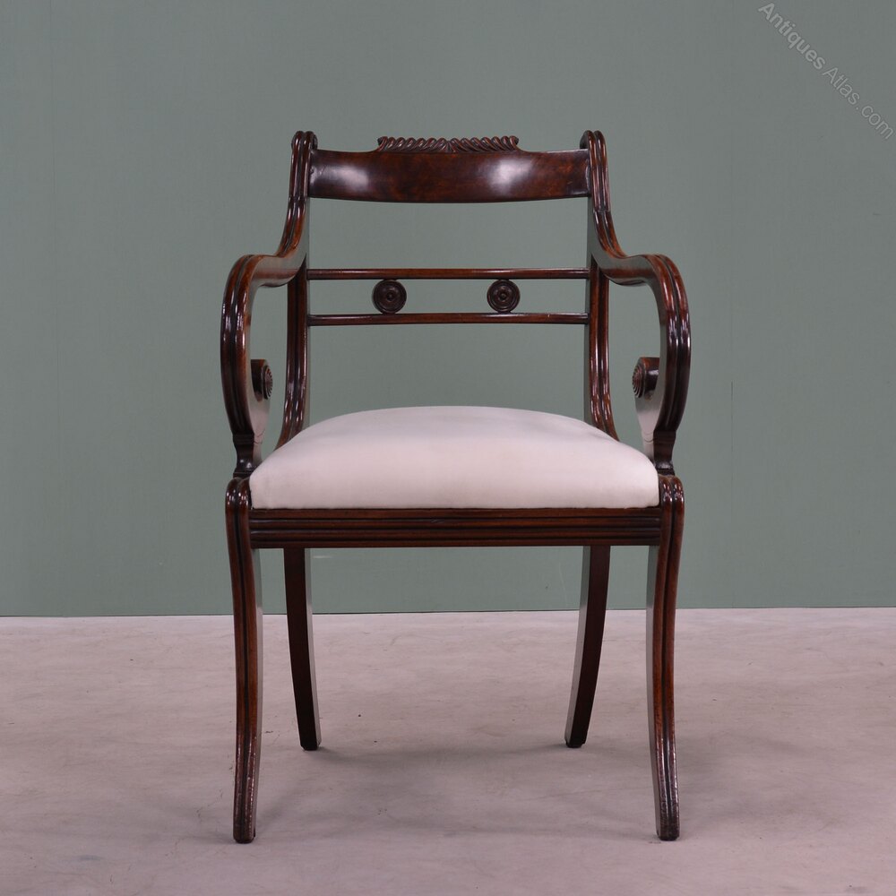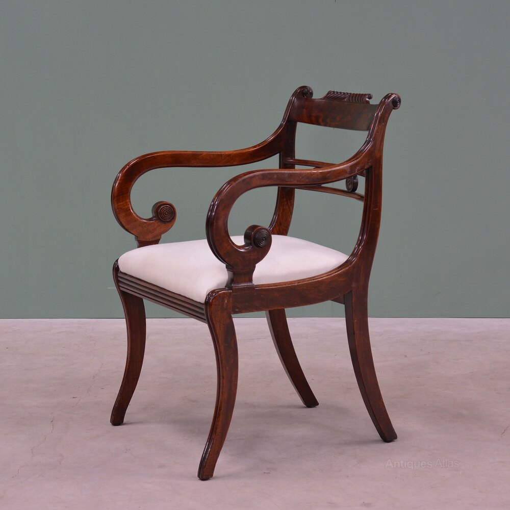 A Regency mahogany armchairThe back with concave cresting with gadroon carving above a pair of rails united by turned paterae. Carved, reeded scroll arms to seat and four sabre legs. Drop in seat, upholstered to linen ready for a top covering of your choice (we can arrange the upholstery).
