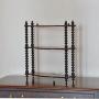 Three tier serpentine fronted hanging shelves with fine bobbin turned supports and a pair of brass hanging rings.