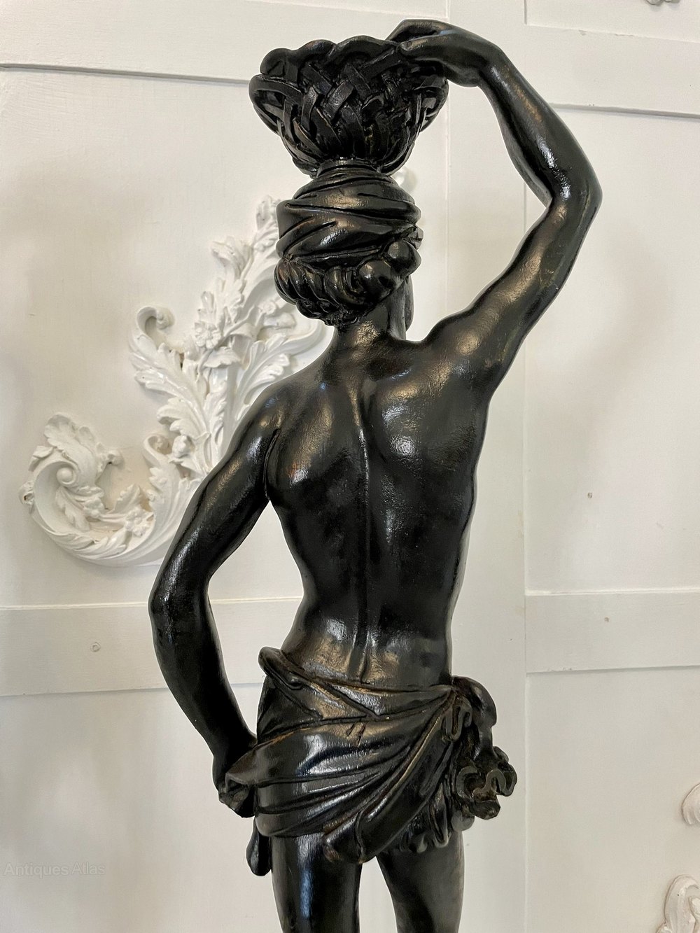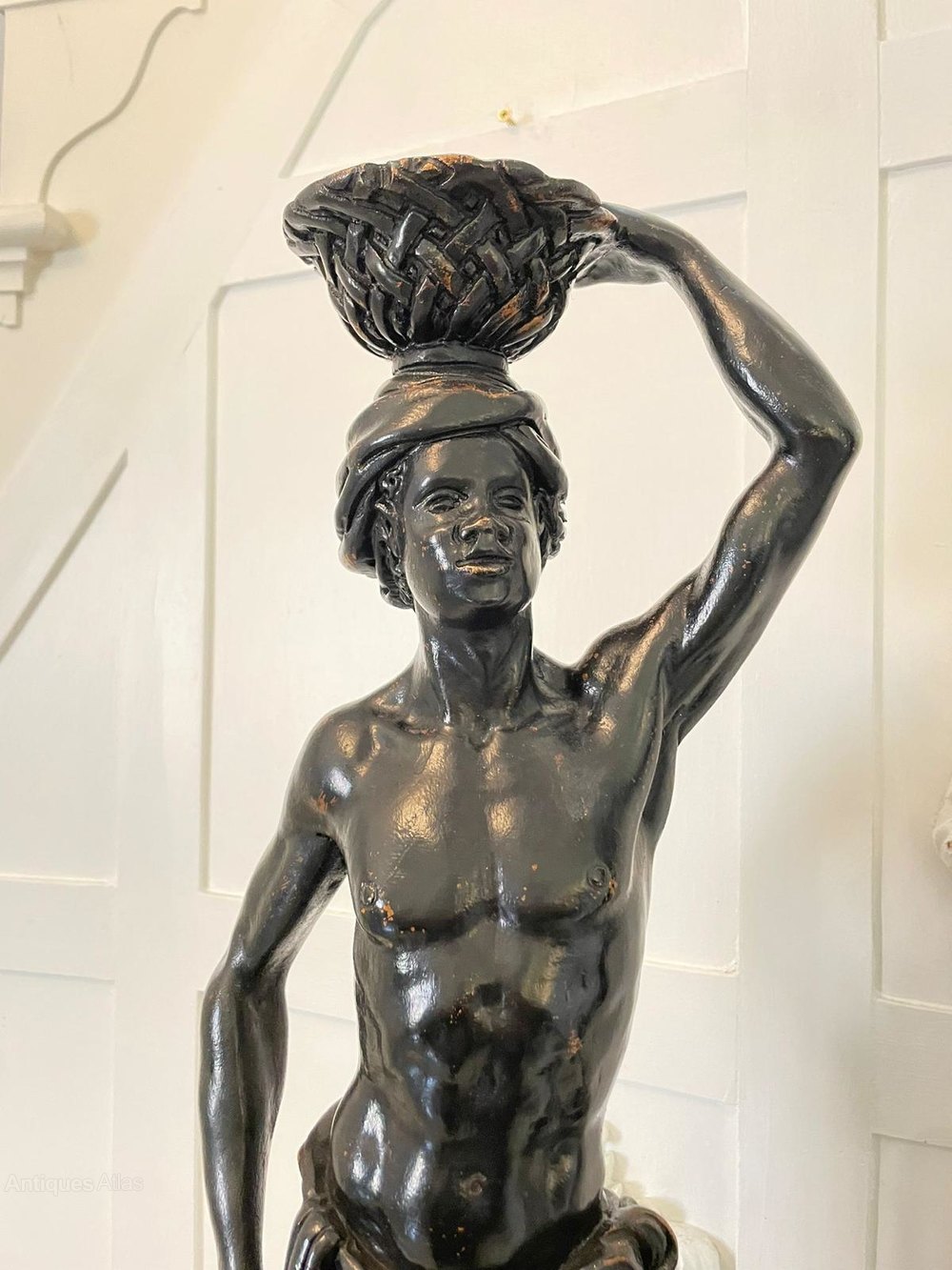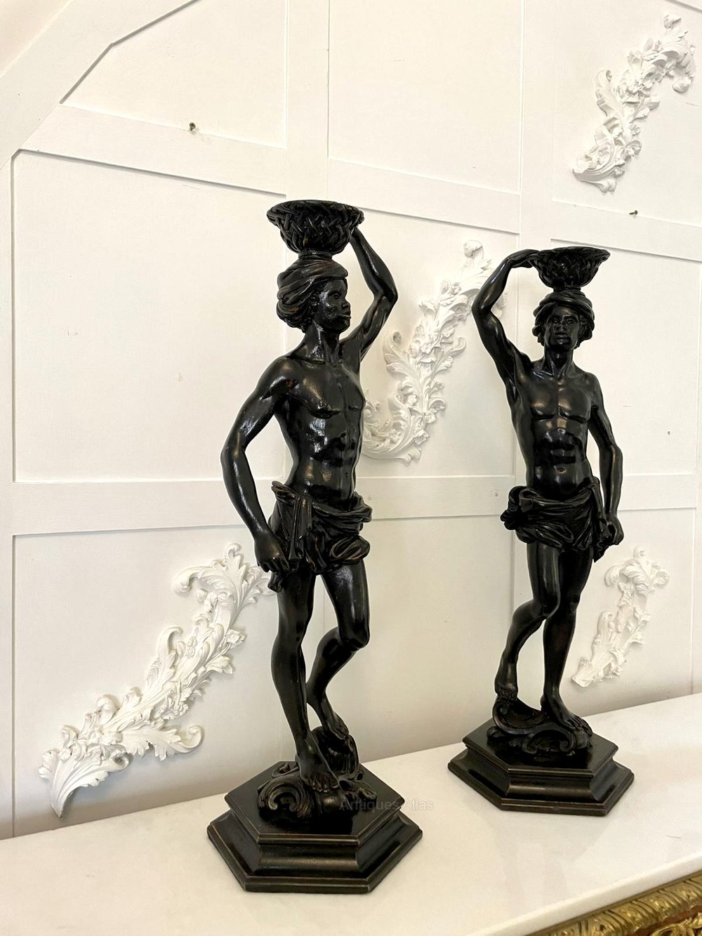 Fine pair of antique Victorian carved ebonised figures both carved as a Blackamoor in a standing pose with a carved basket upon their heads and standing on a carved integral plinth.A fabulous decorative pair, beautifully carved and designed