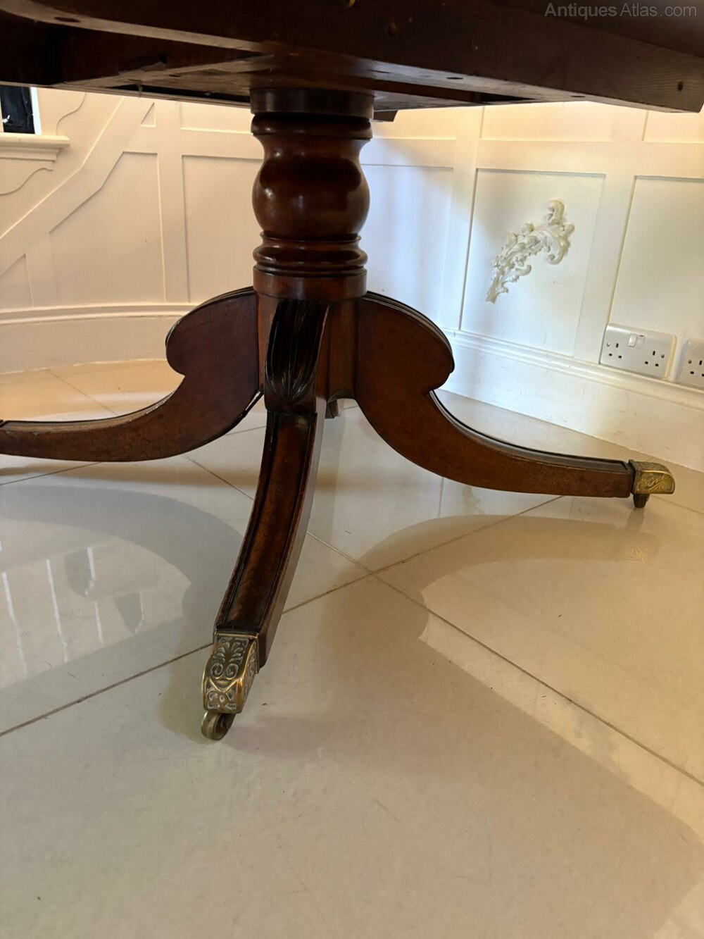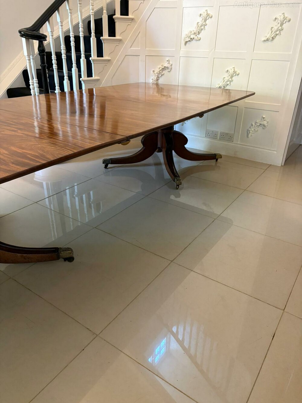 Outstanding quality 16 seater antique George III figured mahogany two pilar dining table having a superior quality figured mahogany top with one large extra leaf supported by turned pedestal columns standing on 4 carved reeded sabre legs with fantastic original ornate brass castors.A fabulous table in wonderful original condition boasting a very desirable colour.