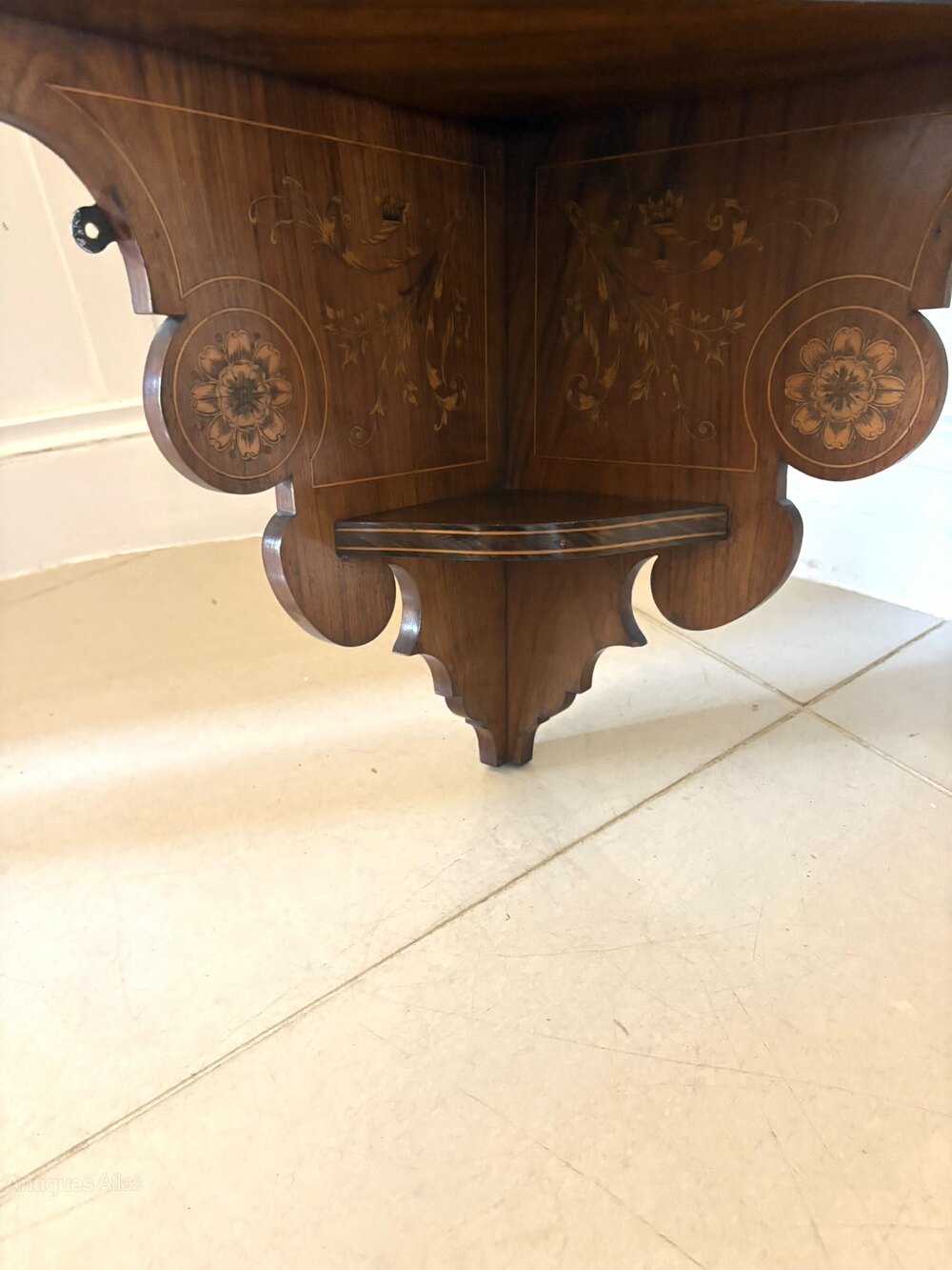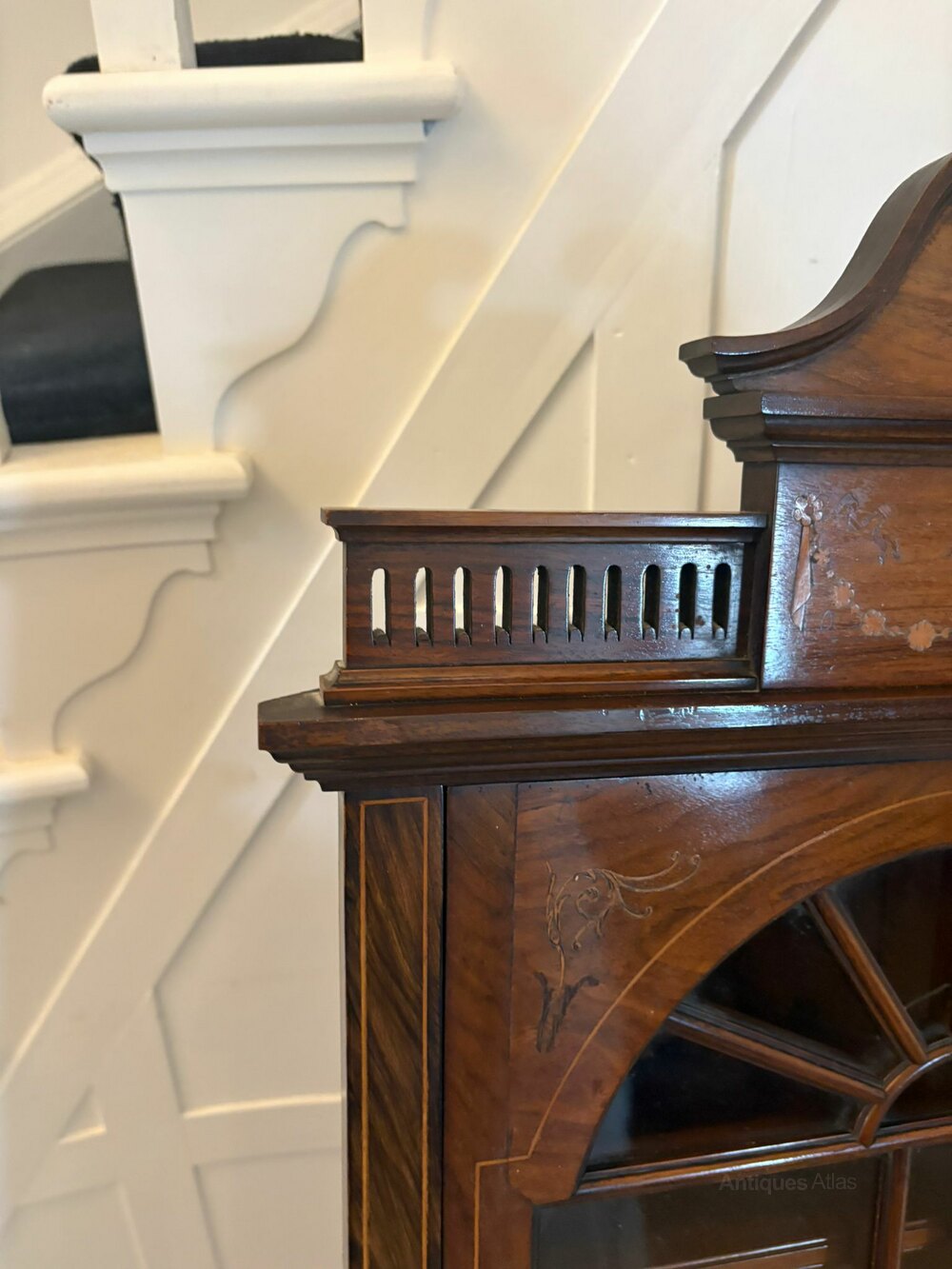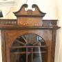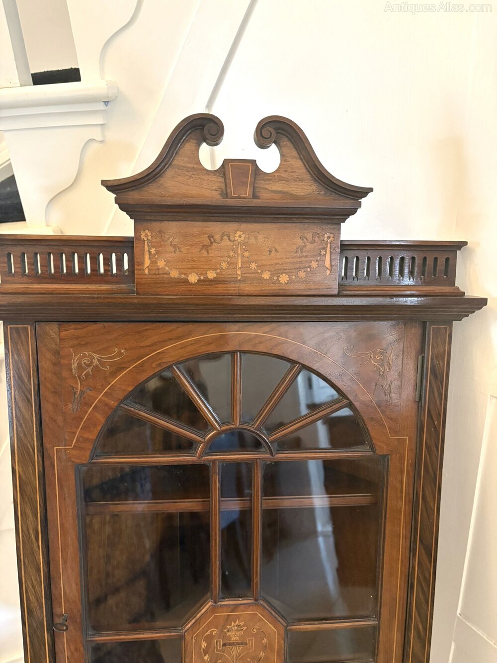 Unusual antique Victorian quality inlaid rosewood hanging corner cabinet having a quality inlaid rosewood swan-neck pediment above an inlaid and carved cornice, single astral glazed door with a inlaid panel to the centre opening to reveal 2 display shelves supported by a shaped bracket.The unusual and attractive shape with its wonderful colour makes this a very desirable piece.
