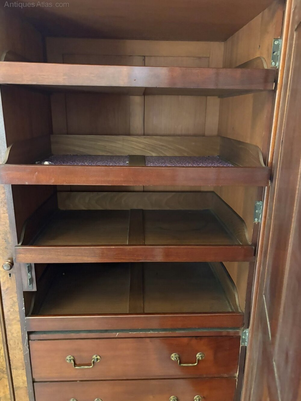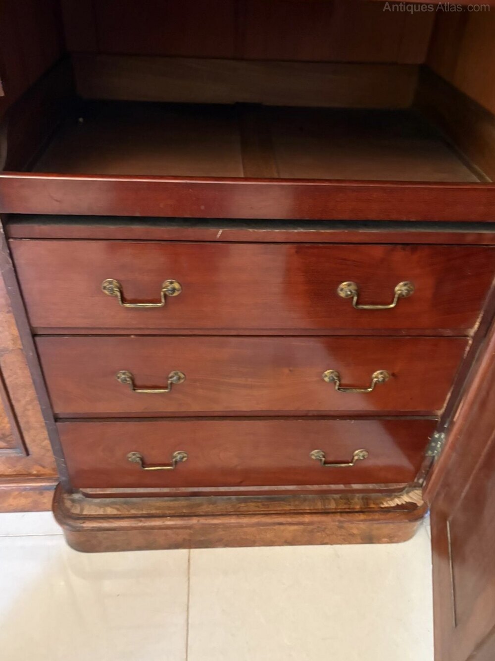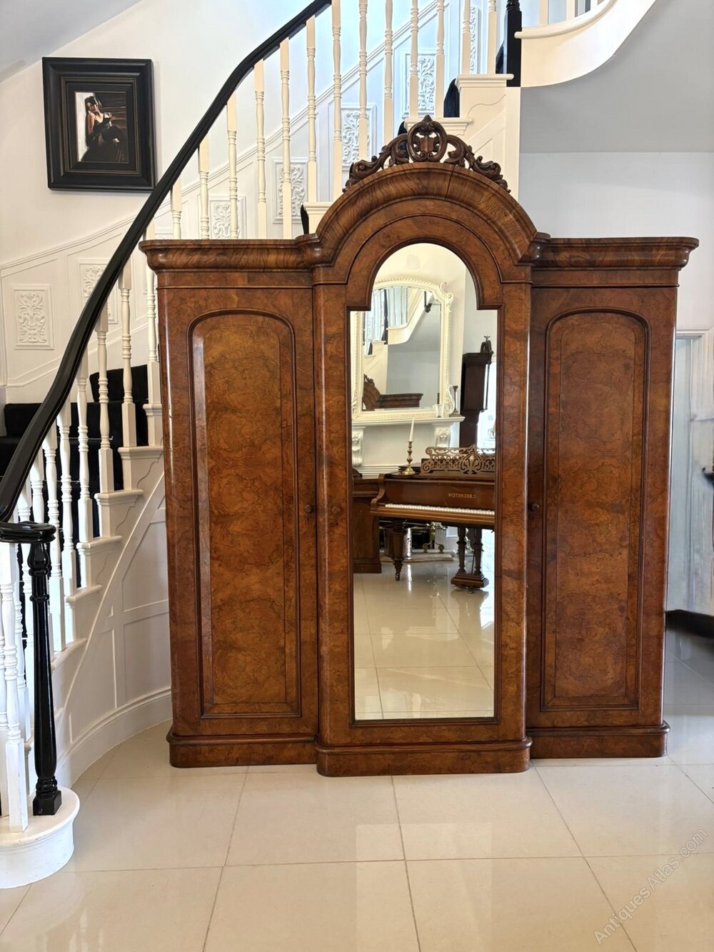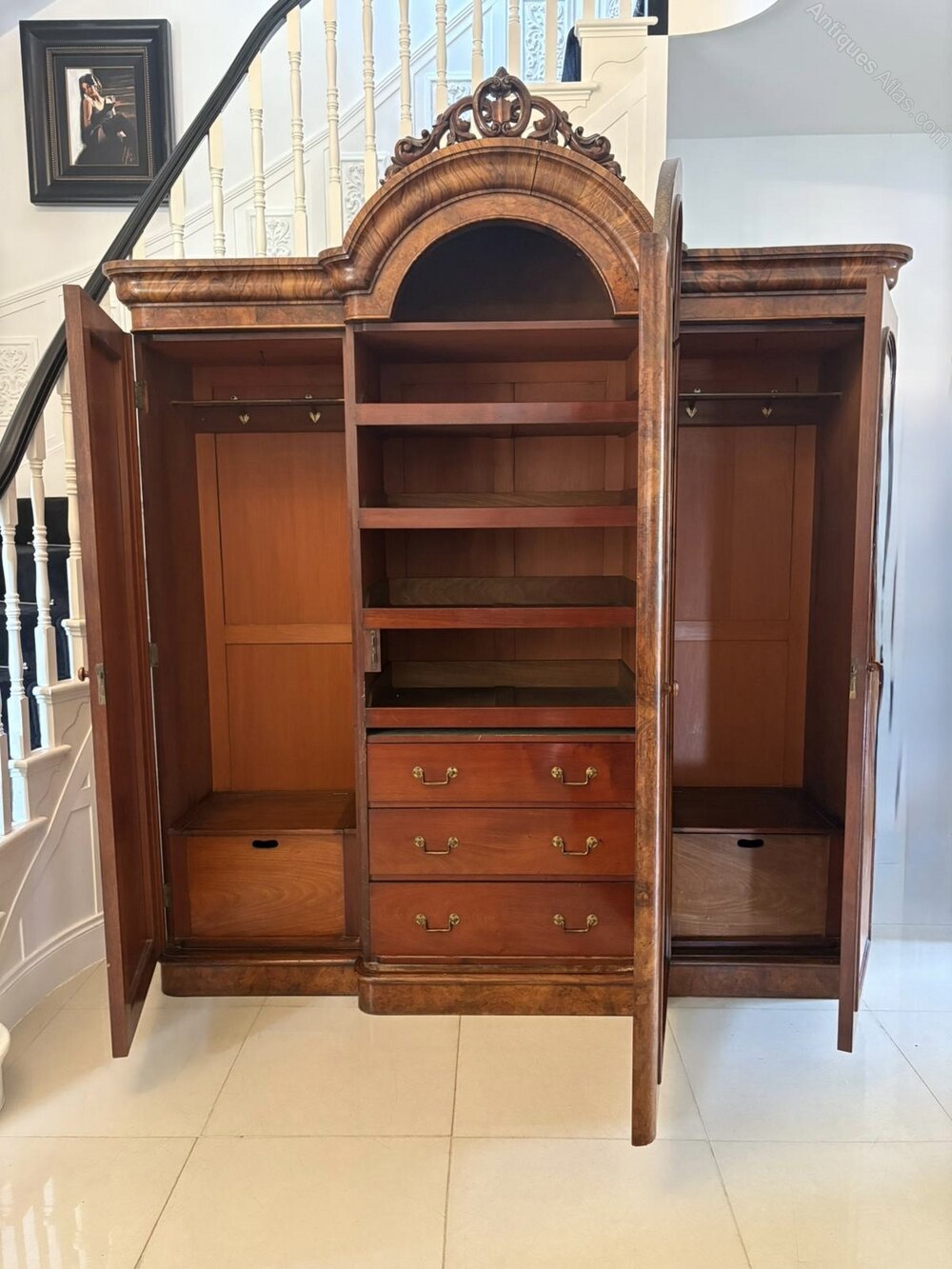 Outstanding quality large antique Victorian burr walnut 3 door wardrobe having a superior quality carved burr walnut arched shaped cornice above a single arched top, burr walnut mirror door opening to reveal a fitted interior consisting of 3 sliding trays and 3 drawers with original brass handles flanked by 2 burr walnut moulded panelled doors opening to reveal hanging space and an unusual mahogany shoebox standing on a plinth base.A striking example of splendid quality displaying a glorious colour.