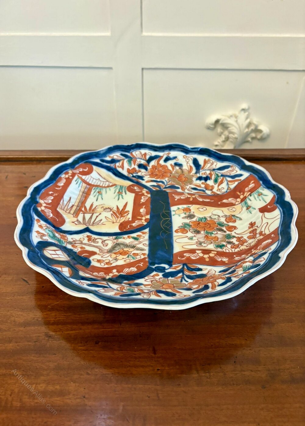 Antique Victorian Japanese quality Imari plate having a scalloped edge with wonderful hand painted panels in red, blue, yellow, green, gold and white colours.Dimensions: