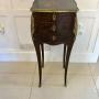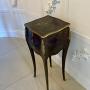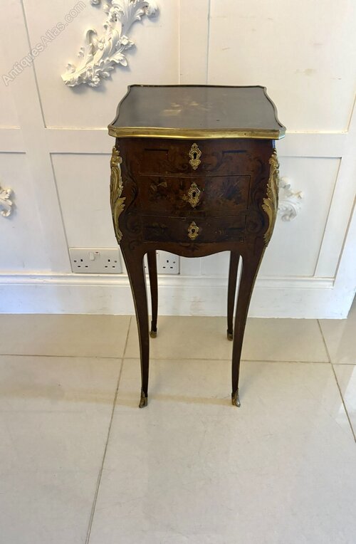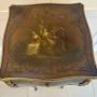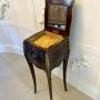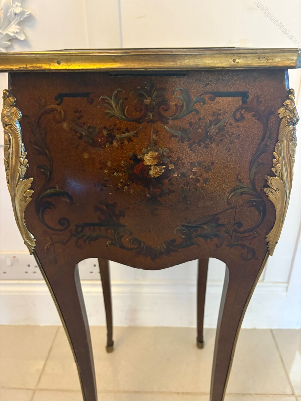 Antique Victorian quality French lacquer ormolu mounted jewellery cabinet having a quality bonnet shape lacquer decoration cabinet depicting a romantic scene, lift up top opening to reveal a mirror and velvet lined interior above two drawers ornate ormolu mounted standing on shaped cabriole legs with ormolu feet.A quaint table which can be used for jewellery or as an attractive lamp/side table or bedside cabinet.