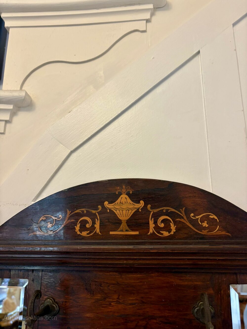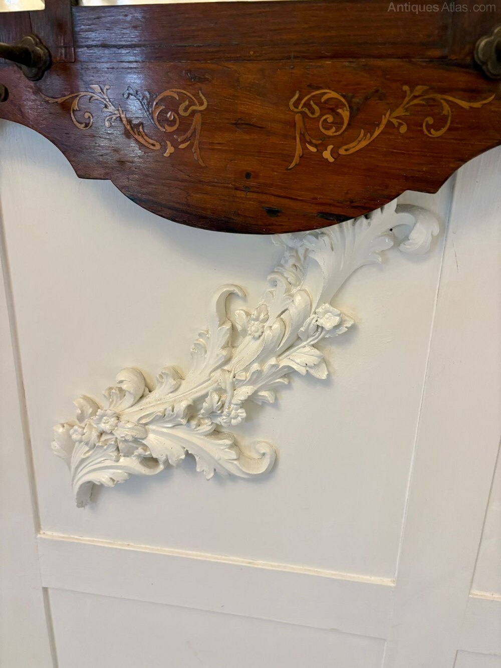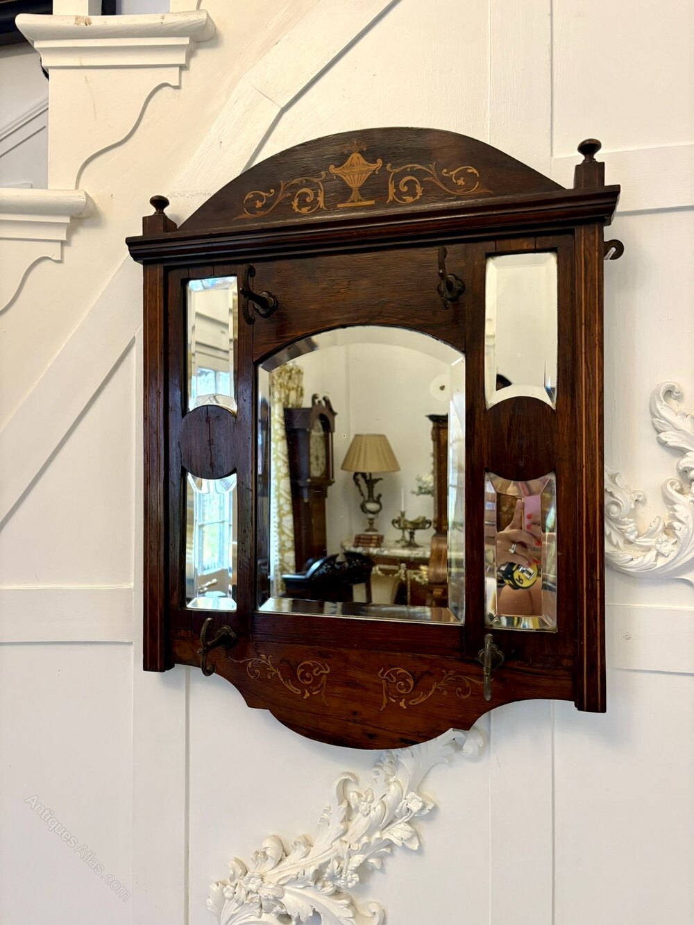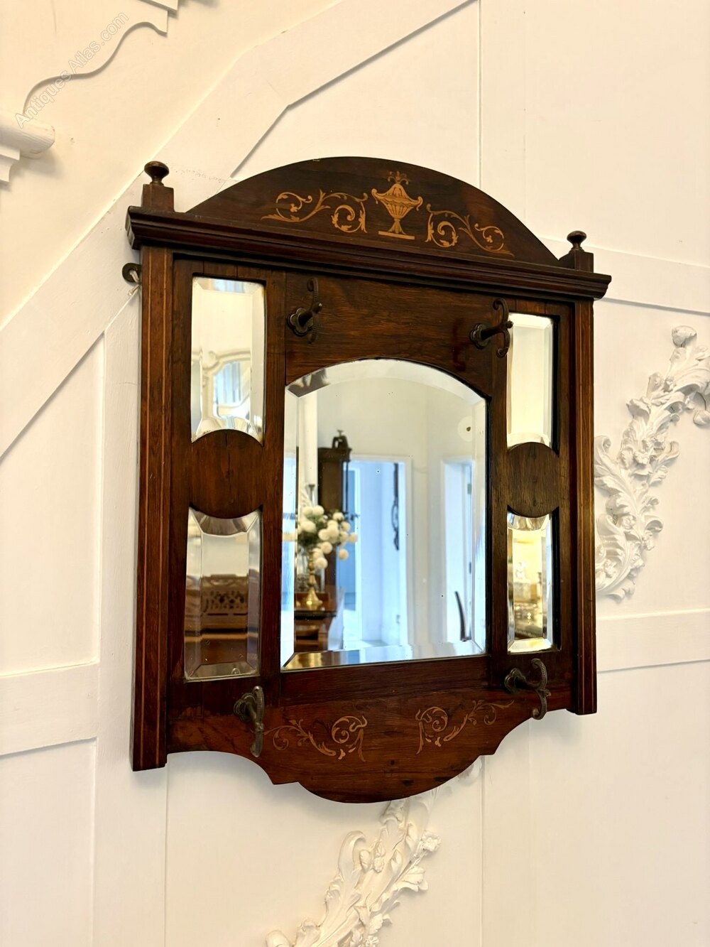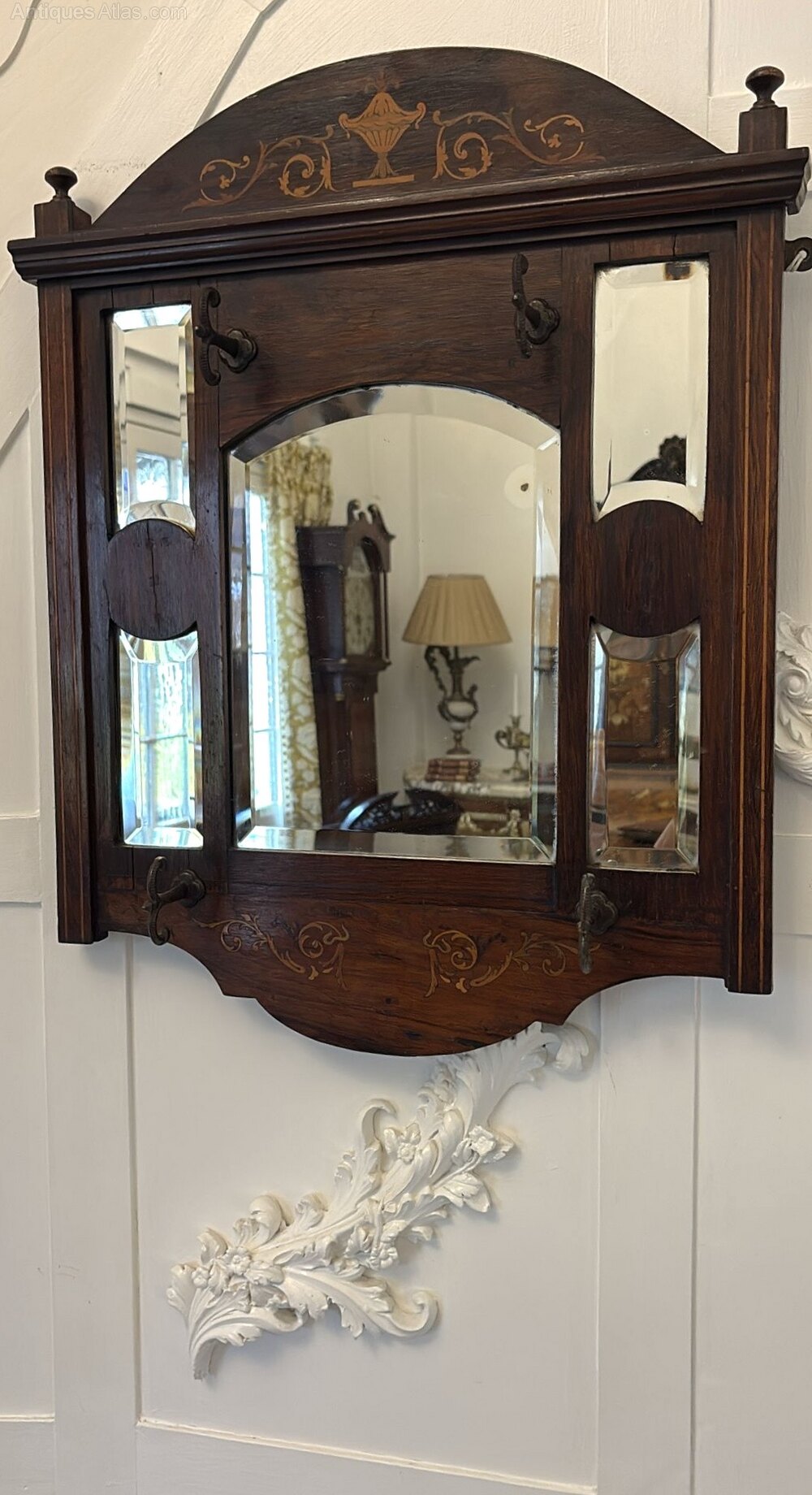 Antique Edwardian quality inlaid rosewood wall/hall mirror having 5 bevelled edge mirrors in a quality inlaid rosewood frame with 4 original irons hooks for hats.An unusual and desirable piece ideal for a hallway or entrance.
