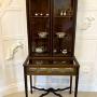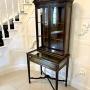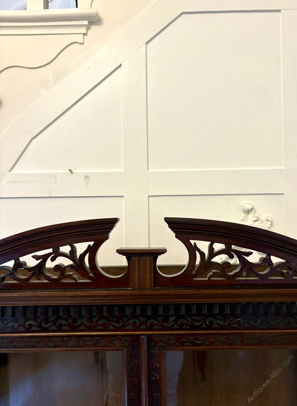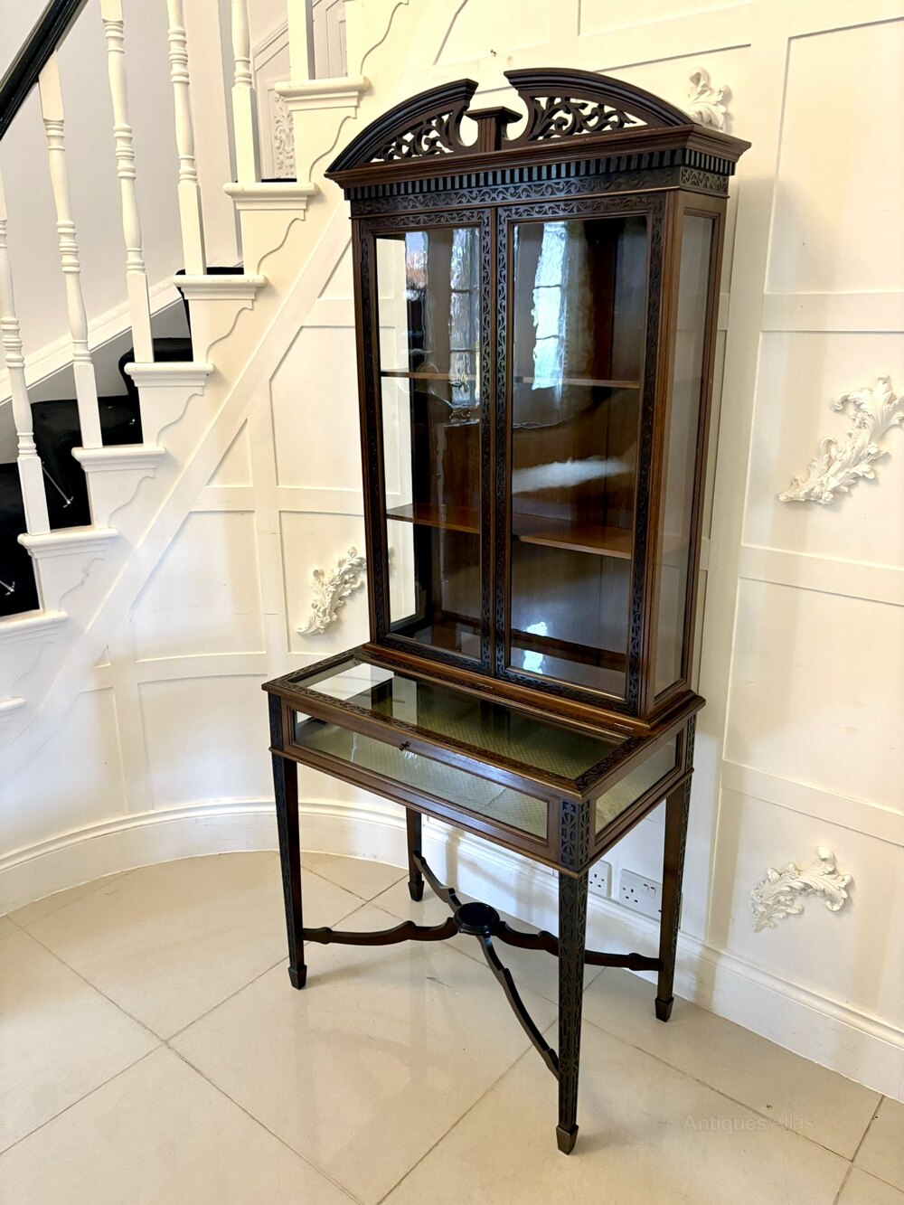 Antique Victorian quality carved mahogany bijouterie display cabinet having a quality carved mahogany 2 door glazed display cabinet with a pretty swan-neck pediment above a carved mahogany bijouterie cabinet standing on square tapering legs with spade feet united by shaped stretchers with a circular undertier.A quaint example in lovely original condition. We can replace the material for something of your choice if desired, please ask for details.