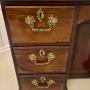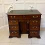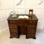 An Antique George III mahogany kneehole desk, beautifully balanced and displaying the restrained elegance typical of late-18th-century Georgian craftsmanship. The desk features a warm, rich mahogany colour, a desirable green tooled leather inset top, a shaped apron, and a central cupboard flanked by banks of smoothly running drawers with origins decorative brass handles.The piece retains a wonderful presence, with a mellow patina developed over generations of use. The original bracket feet, refined proportions, and attractive grain give the desk strong visual appeal while preserving its practical function. A fine and authentic example that would enhance a study, hallway, or boutique interior, offering both storage and a charming working surface.