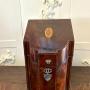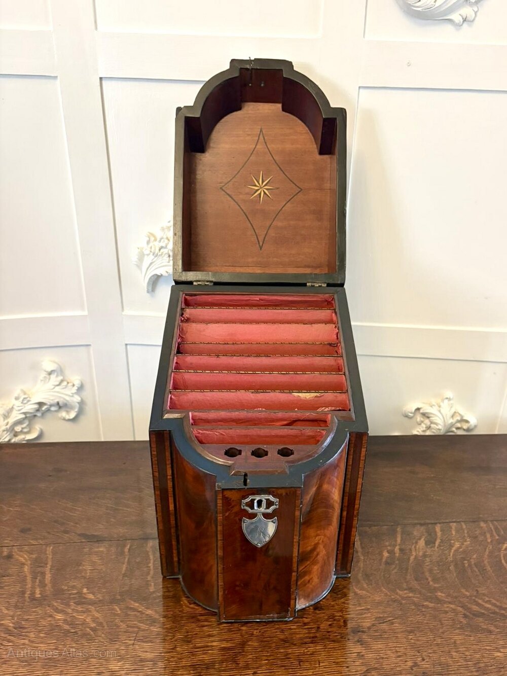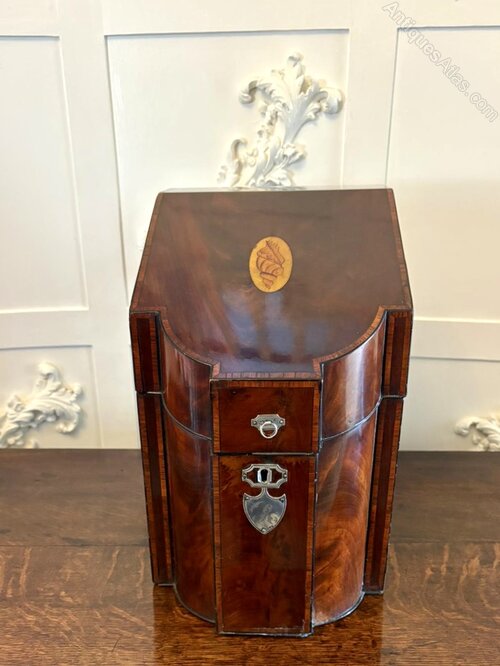 A fine antique Georgian mahogany letter holder of exceptional craftsmanship. Beautifully shaped and richly figured in striking flame mahogany veneers, the serpentine-fronted design with domed sides and delicate ebony line and satinwood inlay creates an elegant silhouette characteristic of high-quality eighteenth-century work.To the front, the piece retains its original silver mounts including a shield-shaped cartouche engraved with the letter R, a charming personal detail that adds both provenance and distinction.