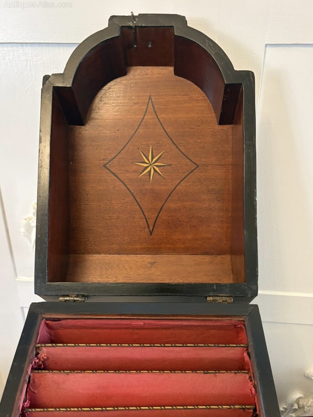 The hinged lid opens to reveal the original fitted interior with multiple divisions for letters, notes and correspondence. The interior retains its original red lining which is attractively worn with age. The inside of the lid features an inlaid compass-star motif, a refined Georgian flourish seen only on superior pieces.