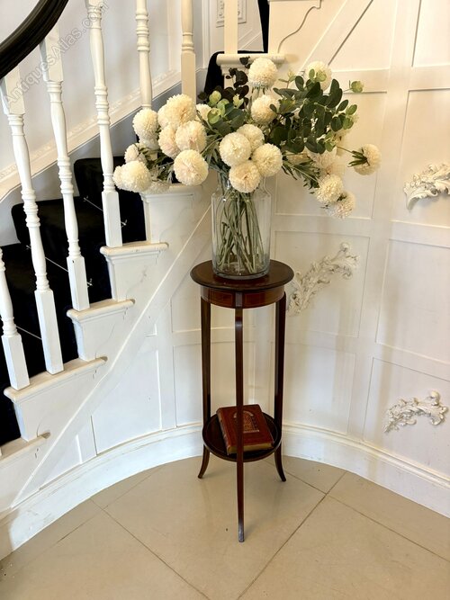 A refined Edwardian mahogany jardinière stand decorated with elegant satinwood inlay giving the piece a subtle yet striking contrast. The circular top features delicate satinwood line inlay set within a moulded edge supported by slender square-section legs that gently curve towards the feet creating a beautifully balanced Edwardian silhouette.A round undertier provides additional stability and display space, also finished with matching satinwood inlay. The warm mahogany tones paired with the crisp satinwood detailing make this a versatile and highly decorative stand, ideal for plants, vases, sculptures or decorative accents throughout the home.