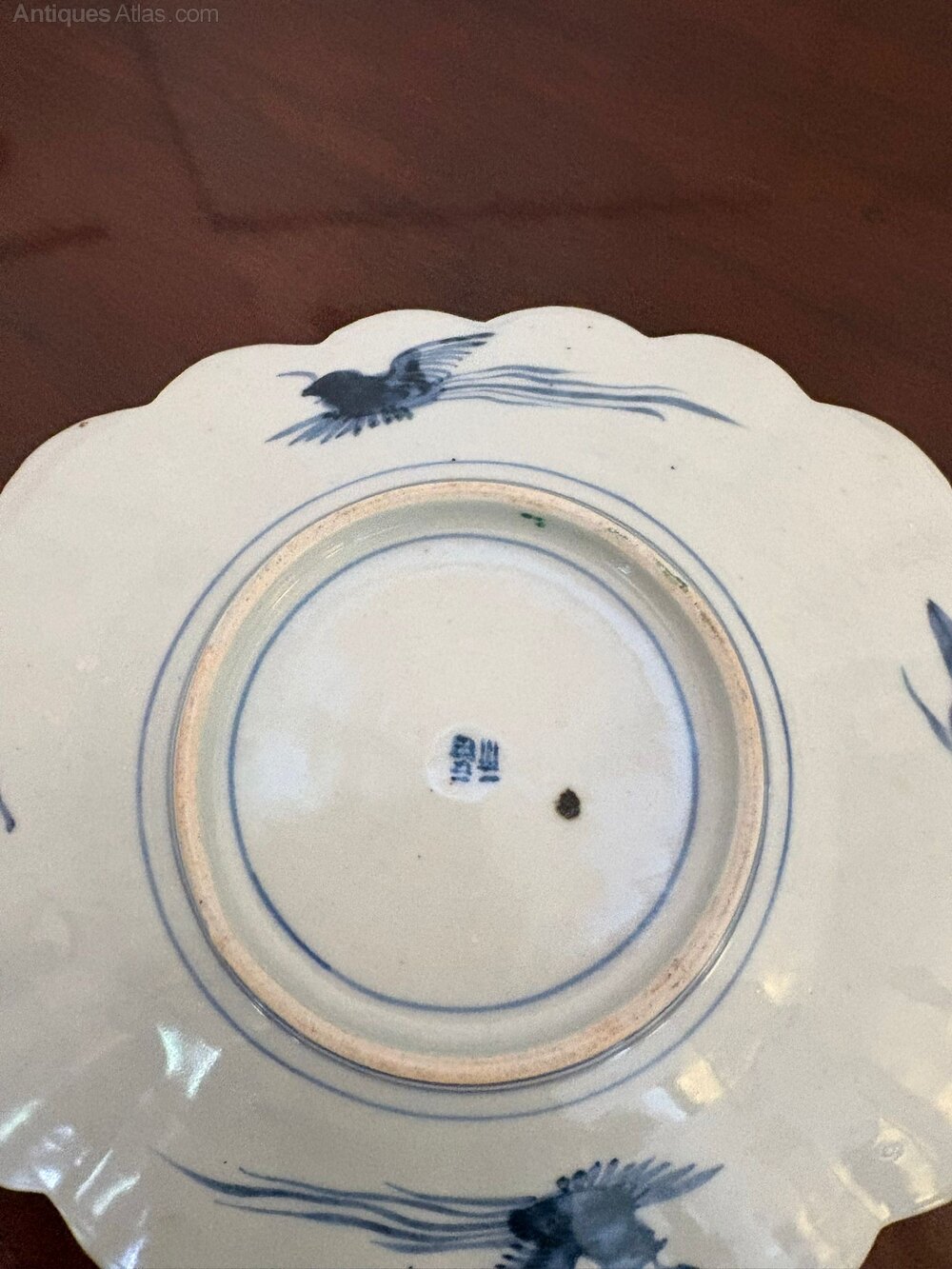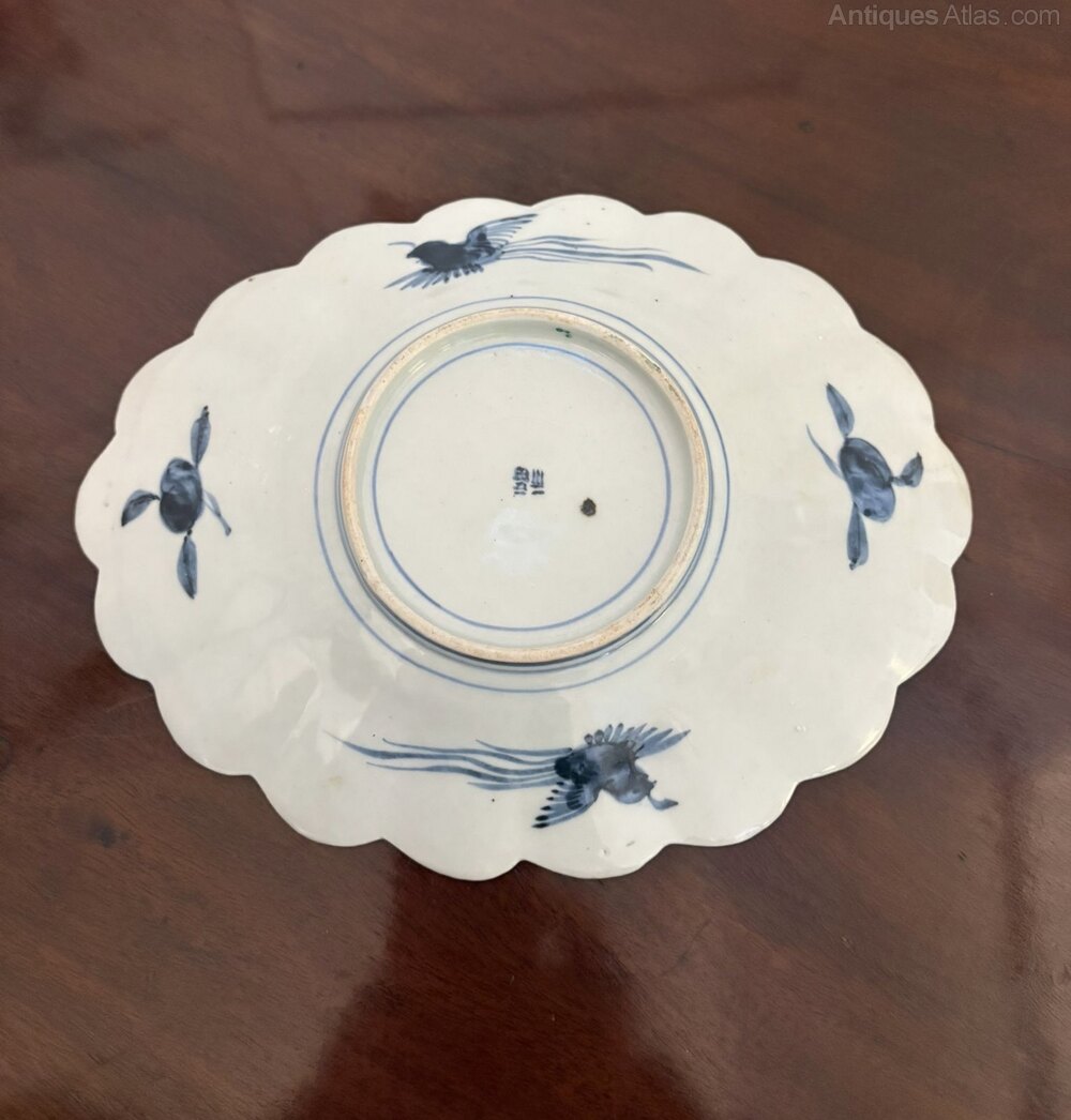 A finely decorated antique Japanese Imari dish of scalloped oval form, painted in the traditional Imari palette of underglaze blue with iron red and gilt highlights. The decoration features flowering branches and stylised floral reserves, arranged around a central cartouche and framed by shaped lobed edges.The reverse is painted with characteristic underglaze blue motifs, including birds in flight, and bears a small hand-painted mark to the base. The painting is expressive and well balanced, with attractive contrast between the cobalt blue, warm iron red, and restrained gilding.
