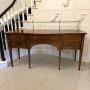 A refined antique Edwardian serpentine sideboard, finely constructed in figured mahogany and enriched with satinwood crossbanding and inlaid detailing throughout. The gently serpentine front is elegantly proportioned with a shaped central drawer flanked by two banks of drawers, all fitted with original brass ring handles.The top follows the serpentine outline and is fitted with its original brass gallery rail supported on turned uprights adding both visual balance and period character. Internally, the drawers retain their original fitted divisions reflecting the quality of manufacture and practical design associated with Edwardian cabinetmaking.