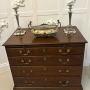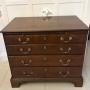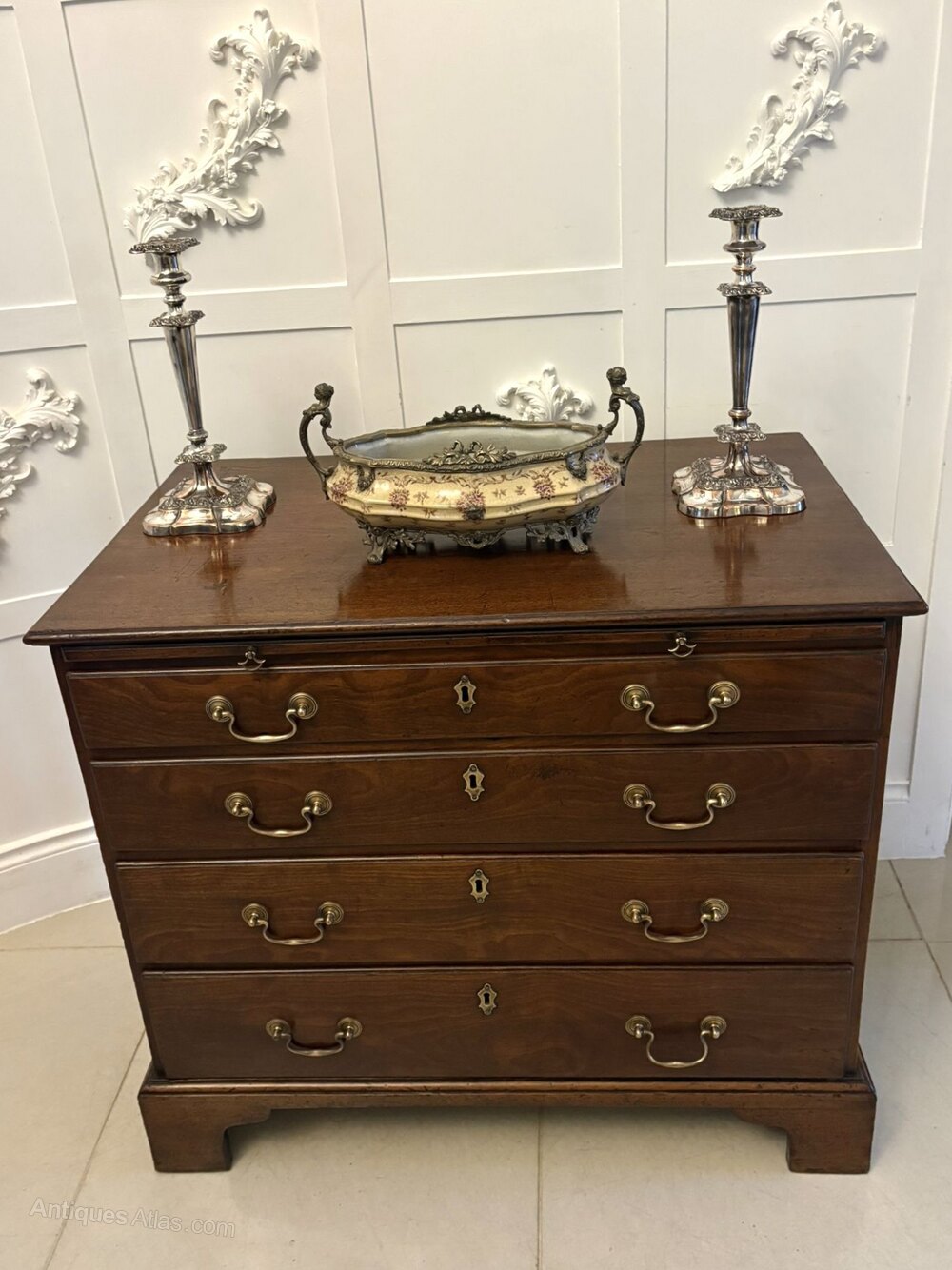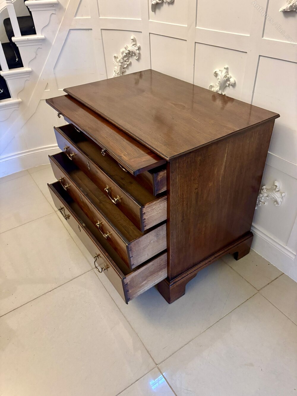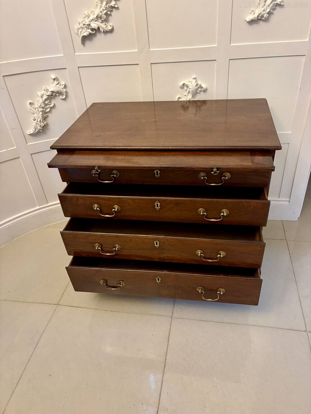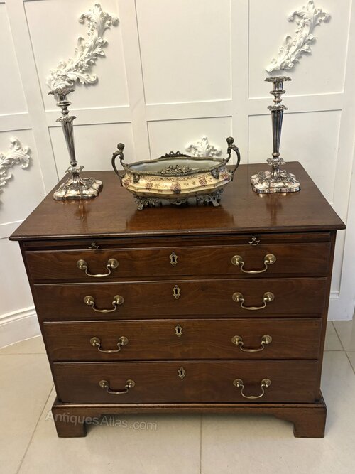 A fine George III mahogany chest of drawers of pleasing proportions showcasing the understated elegance and quality craftsmanship of the period. Constructed in well-figured mahogany, the piece features a moulded rectangular top above a full-width brushing slide, offering both practical use and a desirable period detail.Below are four graduated long drawers each fitted with original brass swan-neck handles and retaining matching escutcheons. The drawers run smoothly and display solid construction with traditional joinery visible to the interiors. The chest stands on a shaped plinth base, lending it a strong yet refined stance.