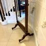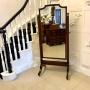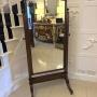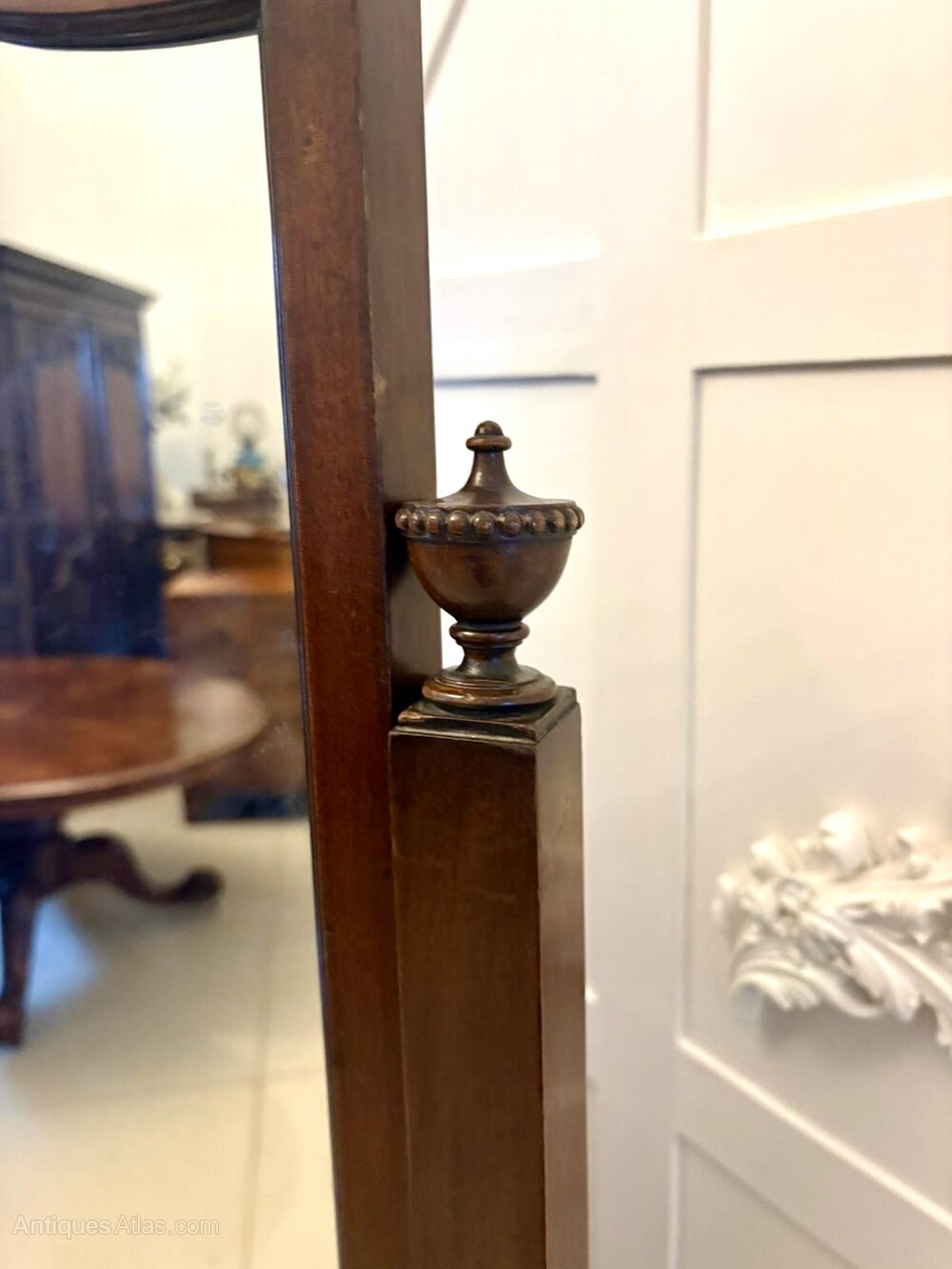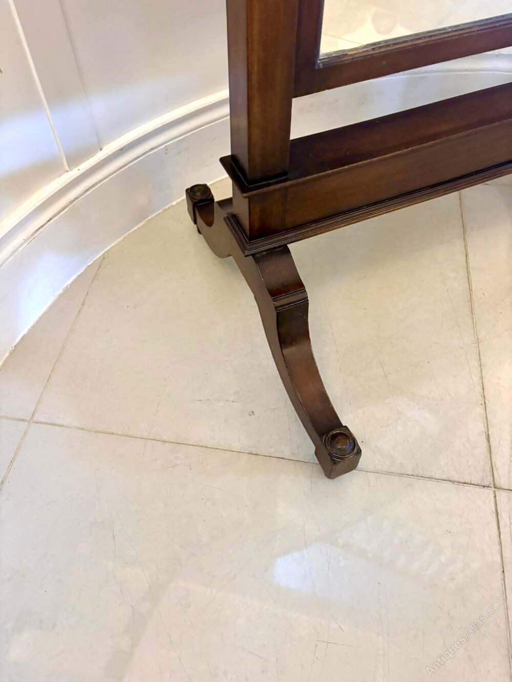 A refined Edwardian cheval mirror crafted in richly toned mahogany displaying elegant proportions and fine carved detailing typical of the period. The shaped rectangular mirror plate is housed within a gently moulded frame, supported by turned uprights with carved finials and a decorative frieze to the base.The mirror retains its original cheval action, allowing smooth adjustment and making it both practical and visually appealing. Raised on shaped legs with scroll feet, the piece has a light, graceful stance and works beautifully in a bedroom, dressing room or hallway. A classic Edwardian form that combines functionality with understated decorative charm.