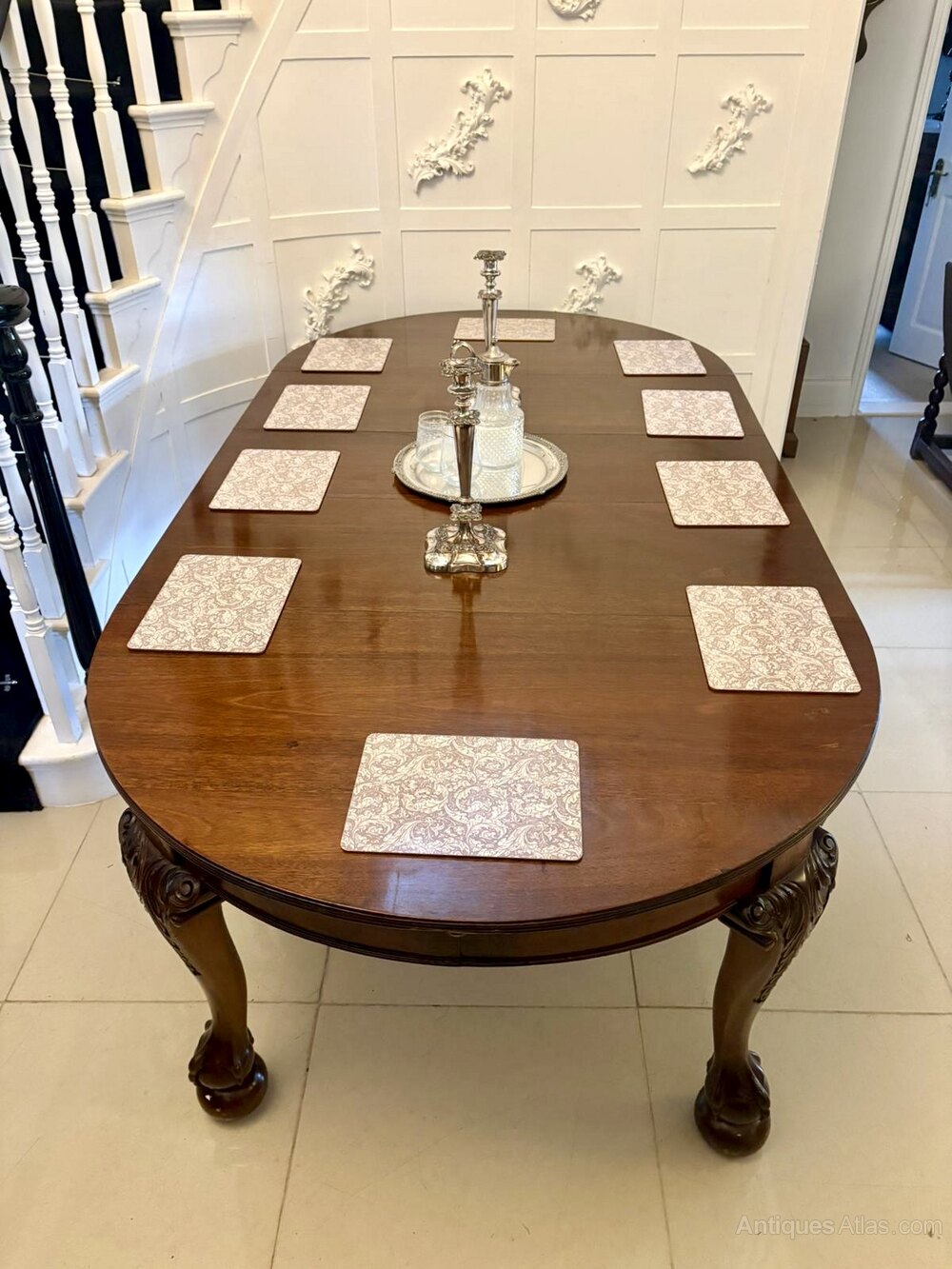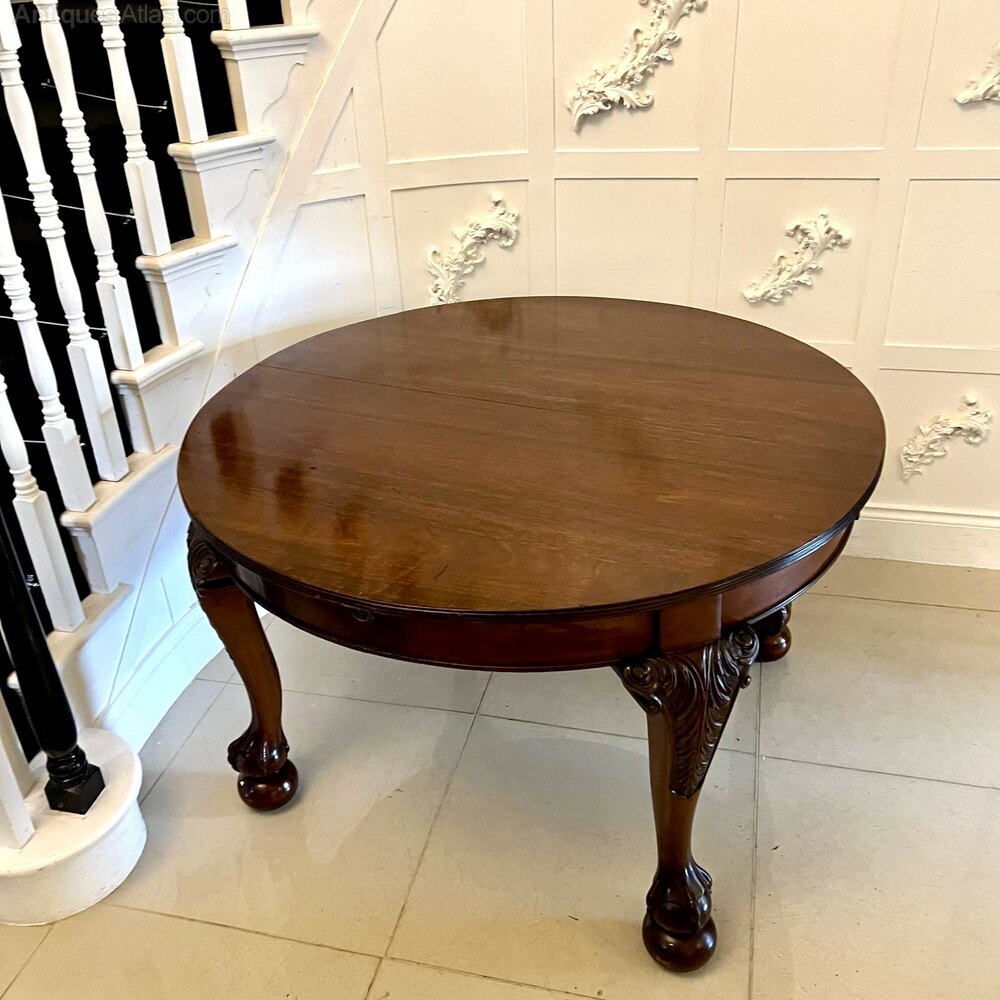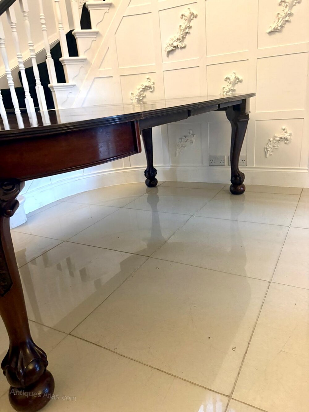A substantial and impressive Victorian dining table crafted in beautifully figured mahogany dating to the late 19th century. The top is of elongated oval form, displaying rich figuring and a well-defined moulded edge, supported on boldly carved claw and ball legs, a classic and highly sought-after Victorian feature.The carving to the legs is confident and crisp, giving the table strong visual presence while retaining elegant proportions. This form is both decorative and highly practical, making it an ideal centrepiece for a large dining room or formal entertaining space.
