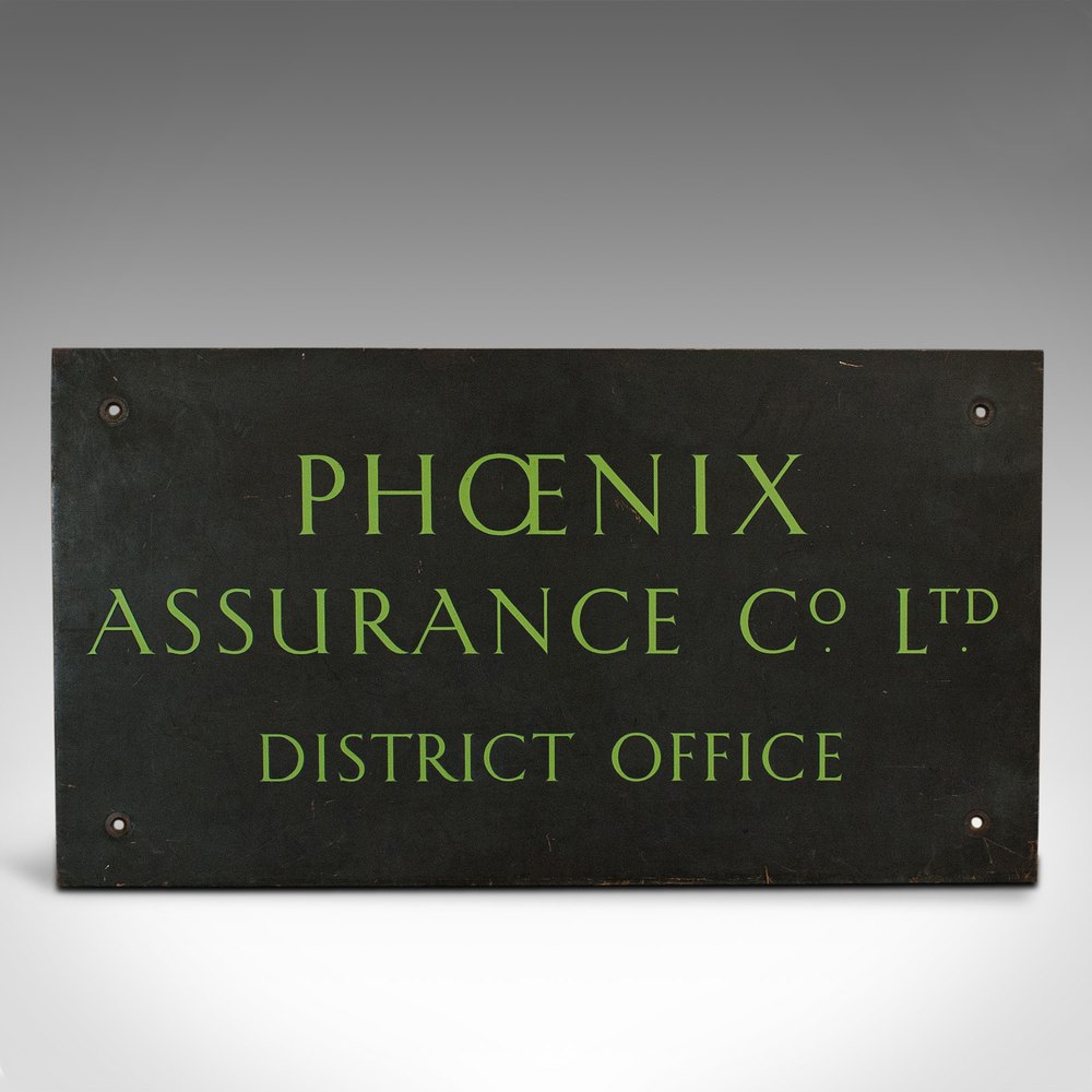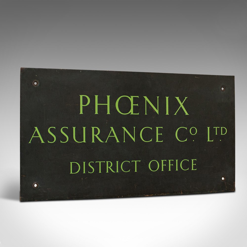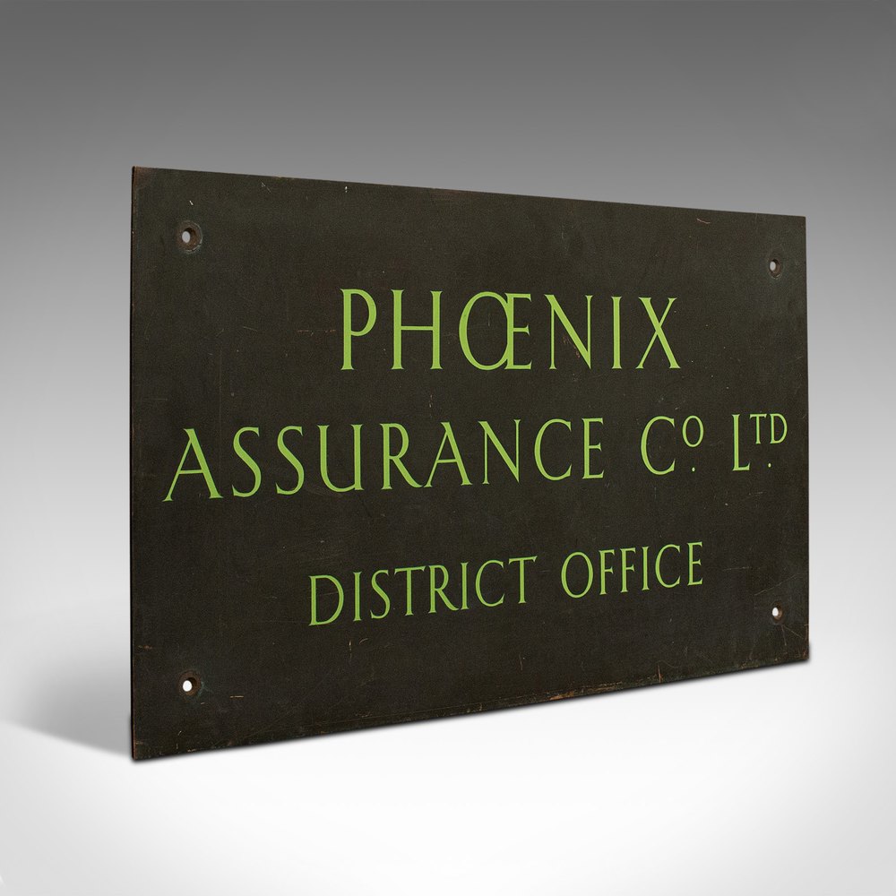 This is a vintage commercial sign. An English, bronze sign-written name plaque for Phoenix Assurance, dating to the mid 20th century, circa 1950.Solid, elegant commercial sign