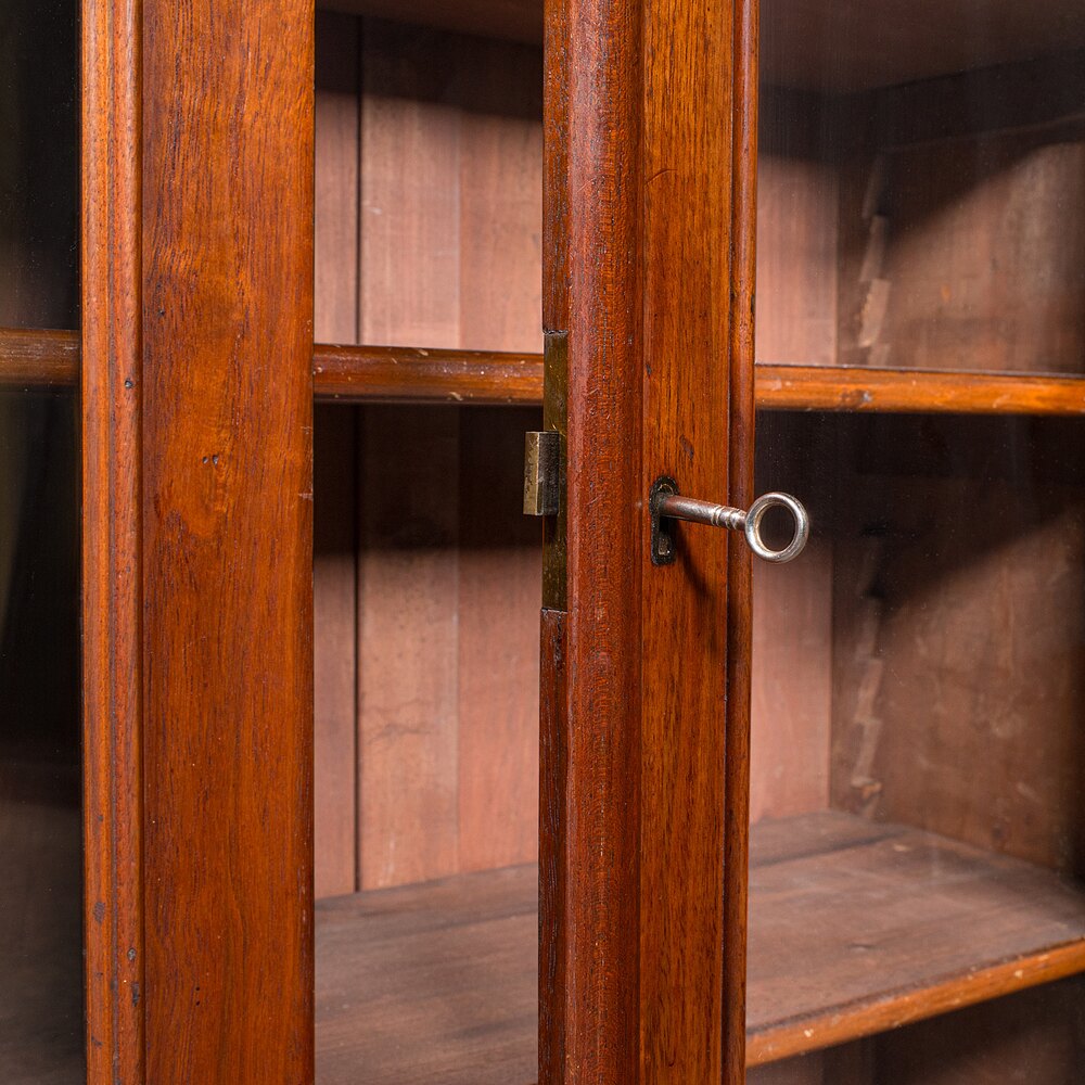 A charming late Victorian glazed book cabinet, offering elegant display and dependable storage in a warm mahogany palette. Solid joints and construction, delivered ready for the home.