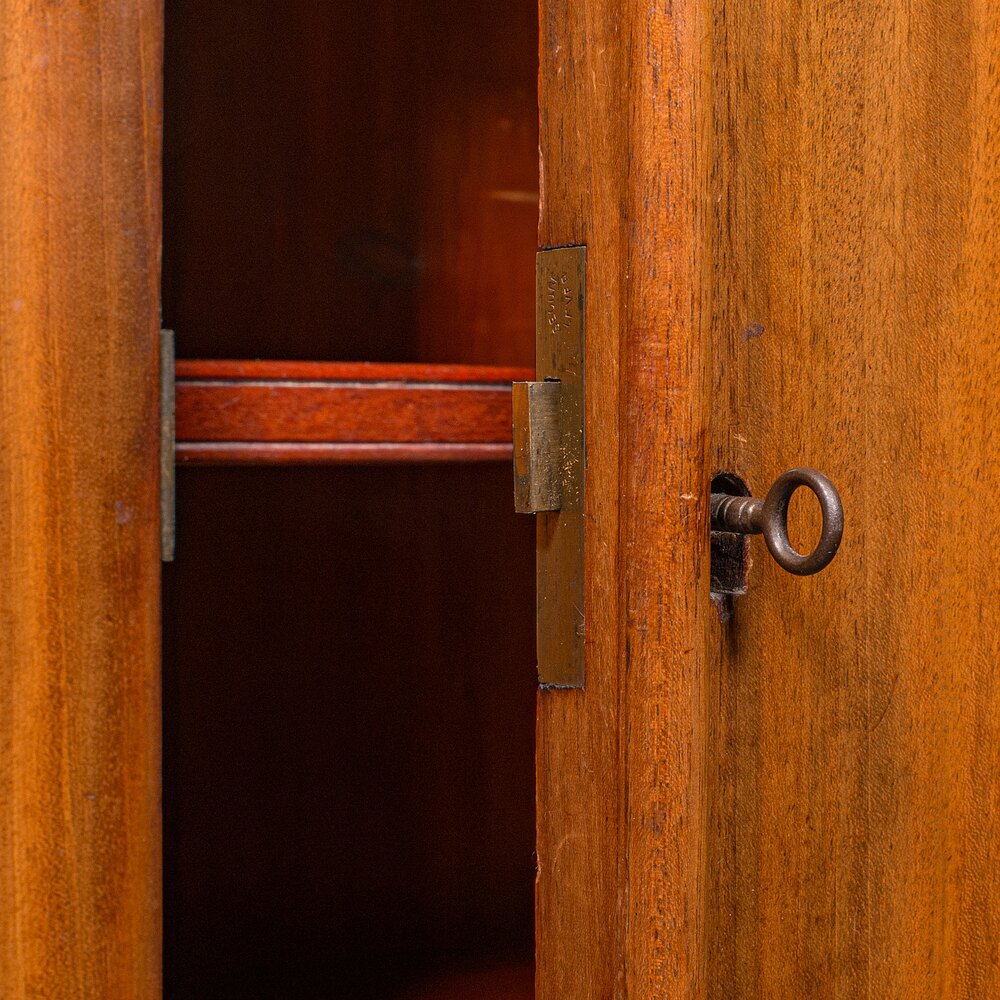 Pair of tall frieze doors enclose the cabinet, the right hosting an inset working lock — key present