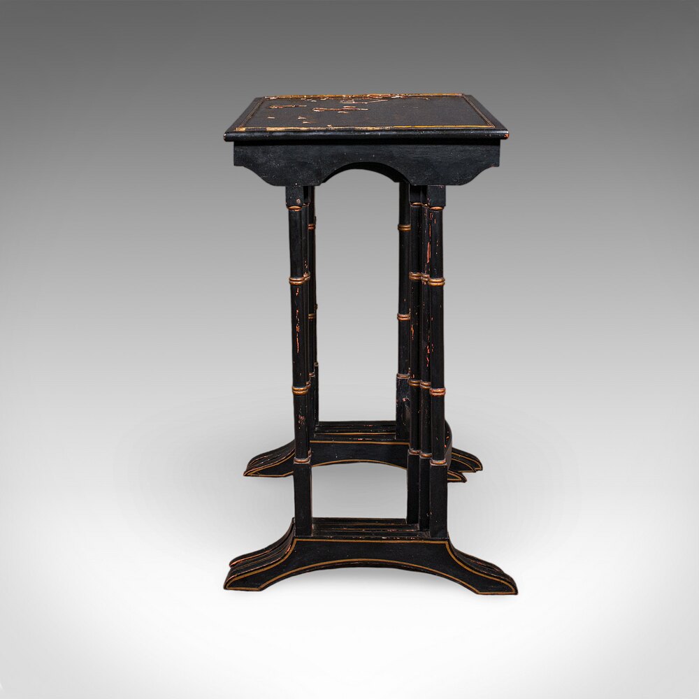Our Stock # 25749This is a trio of antique nesting tables. An English, Waring & Gillow occasional table set with a Japanned lacquered finish, dating to the Edwardian period, circa 1910. A superb example of early 20th century decorative furniture by a highly respected maker.