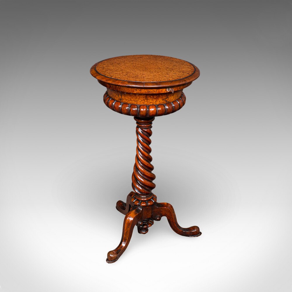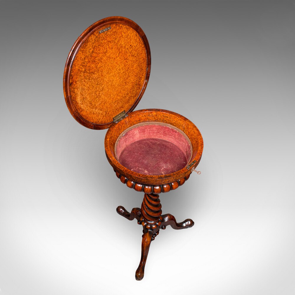 Our Stock # 25766This is an antique spirits table. An English, burr maple and walnut decanter & glasses stand or teapoy, dating to the William IV period, circa 1835. An exceptional drawing room drinks stand of superb craftsmanship, and rich visual appeal.