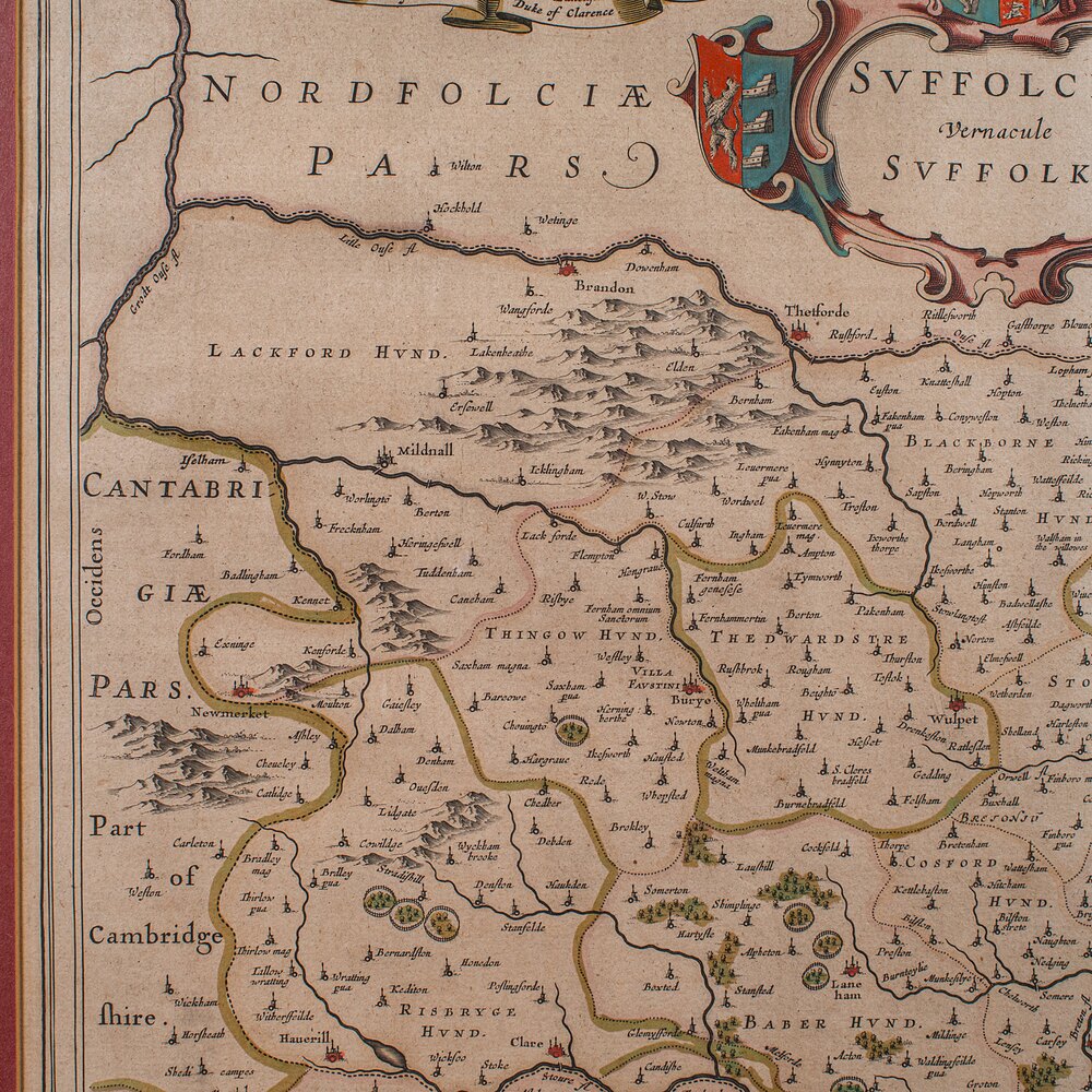 Our Stock # 25811This is an antique county map of Suffolk. A Dutch, framed atlas engraving by Joan Blaeu, dating to the 17th century and later.