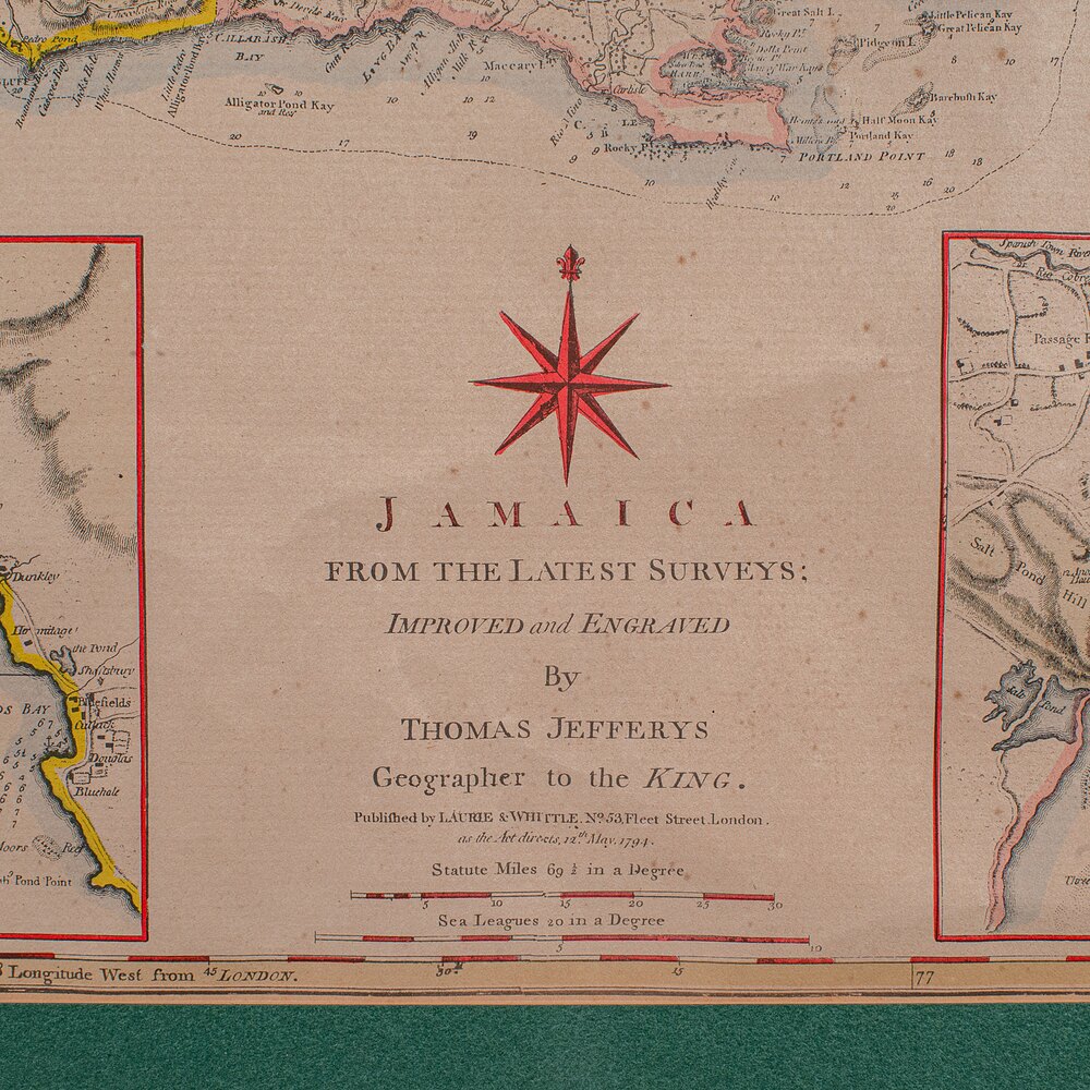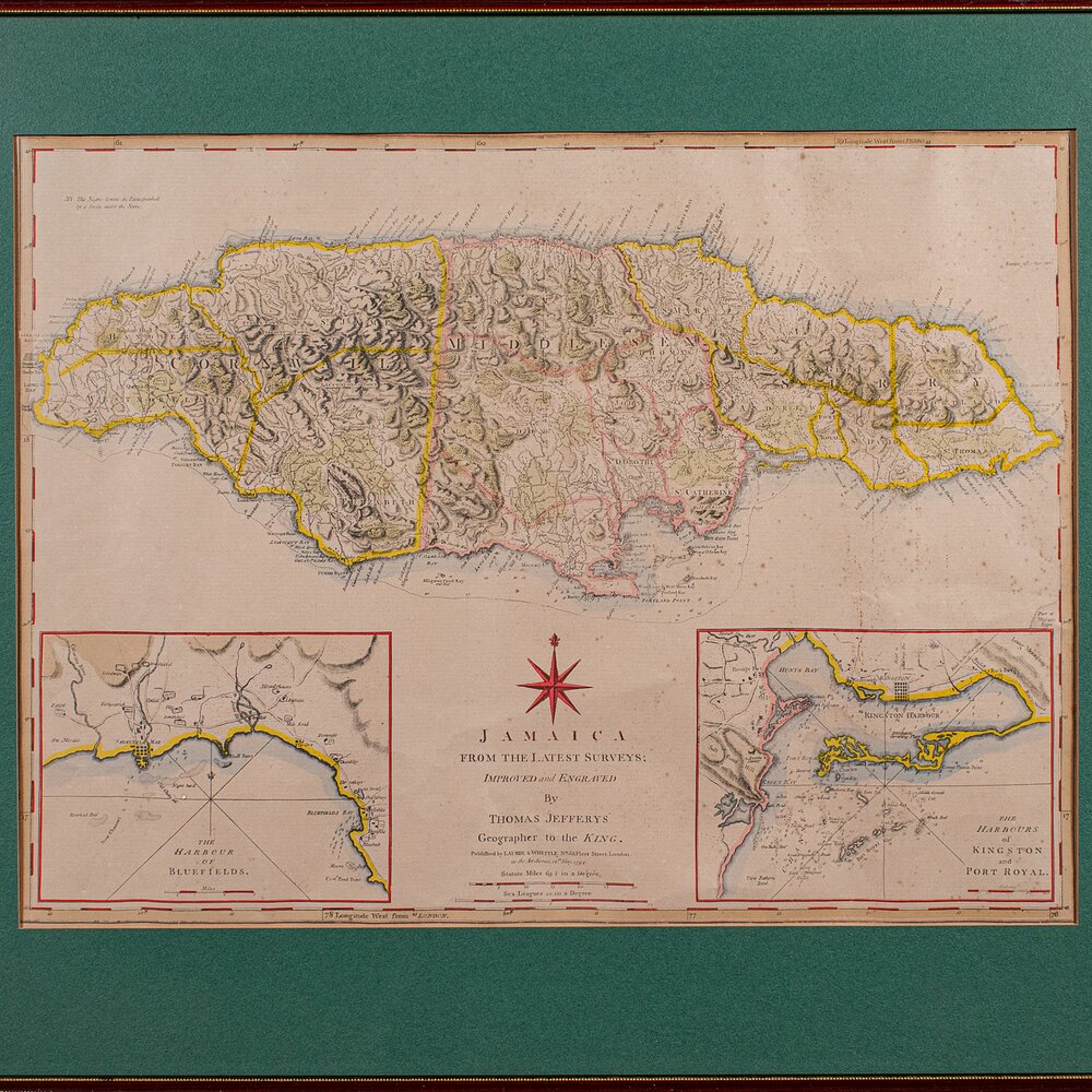 Our Stock # 25817This is an antique Jamaica map. An English, framed Caribbean island engraving by Thomas Jefferys, dating to the 18th century and later, dated 1794.
