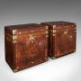 Our Stock # 25862This is a pair of late vintage luggage trunks. An English, leather and brass bedside nightstand, or occasional tables with storage, offering 21st century campaign revival styling.