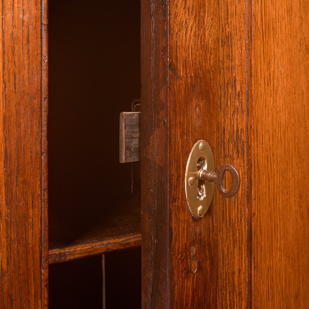 Field panel door dressed with a brass oval lock escutcheon — in working order, key present