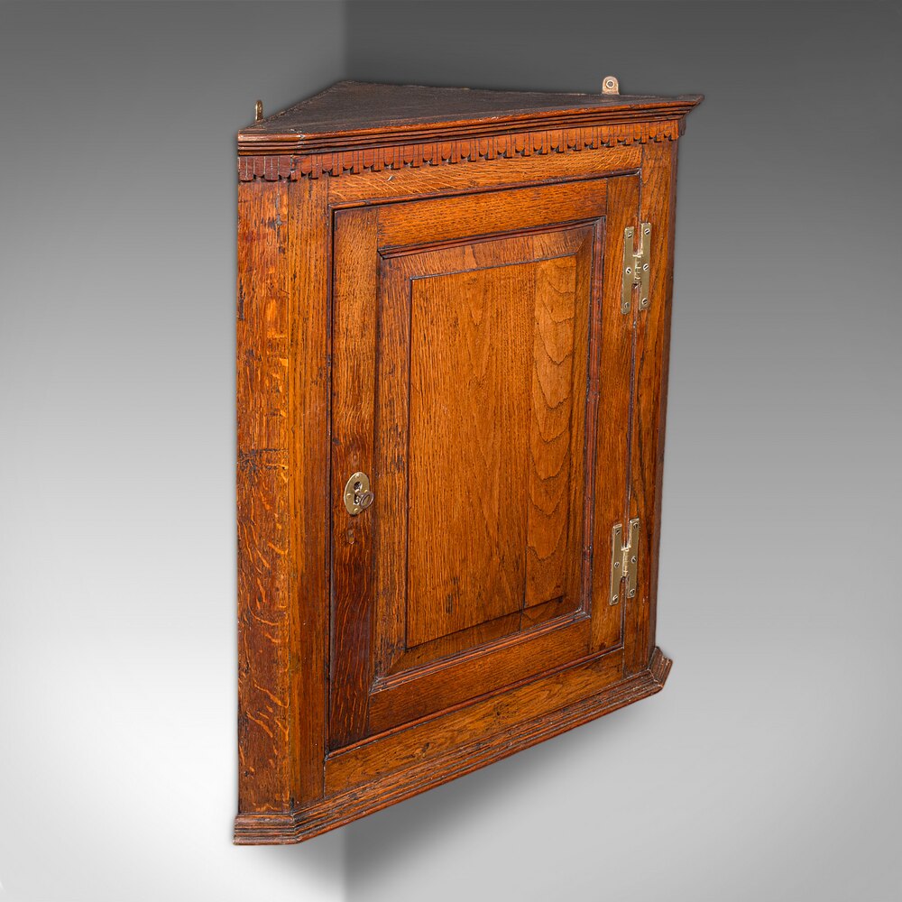 This small antique corner cabinet is a fine example of mid-18th century English craftsmanship, boasting delightful golden oak stocks and refined proportion. Solid joints and construction, delivered ready for the home.