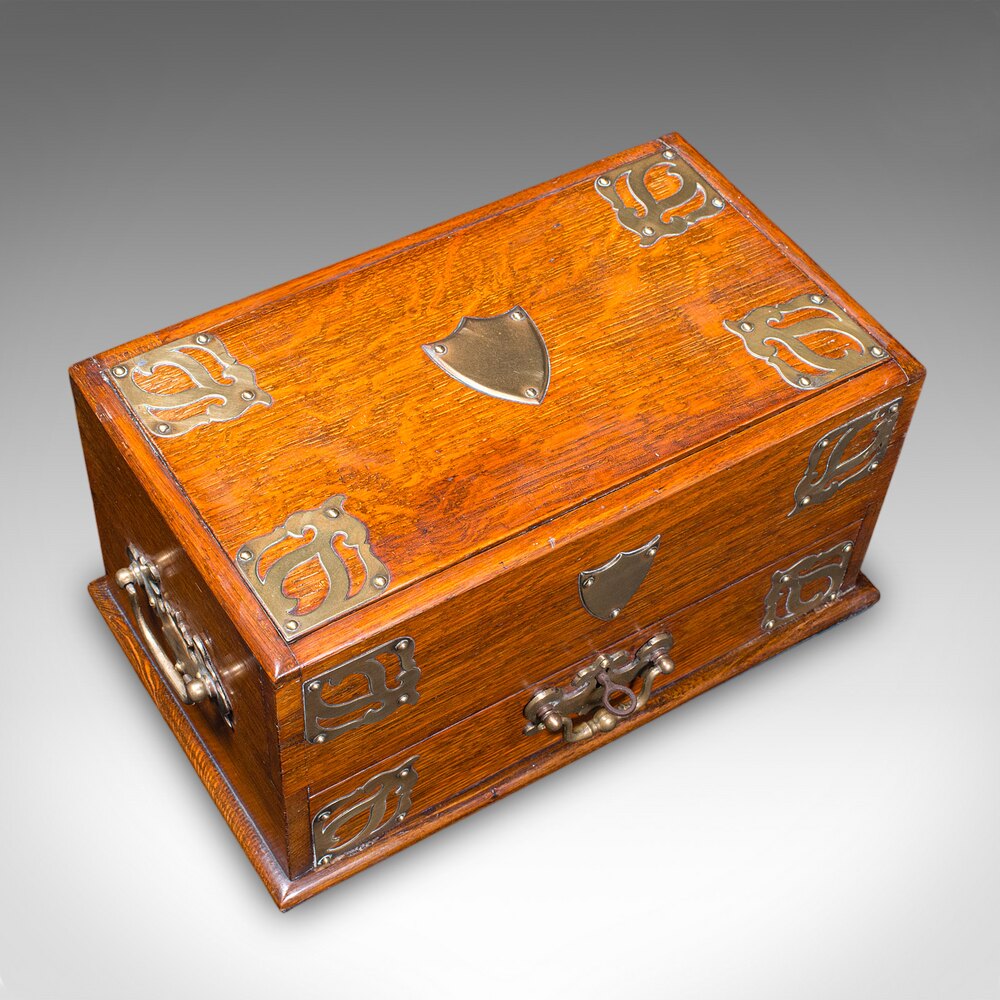 Our Stock # 25918This is an antique smoker’s box. An English, oak and brass cigar case, dating to the Edwardian period, circa 1905. A superbly appointed gentleman’s accessory, offering refined presentation and practical storage for cigars and smoking requisites.
