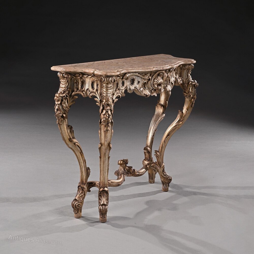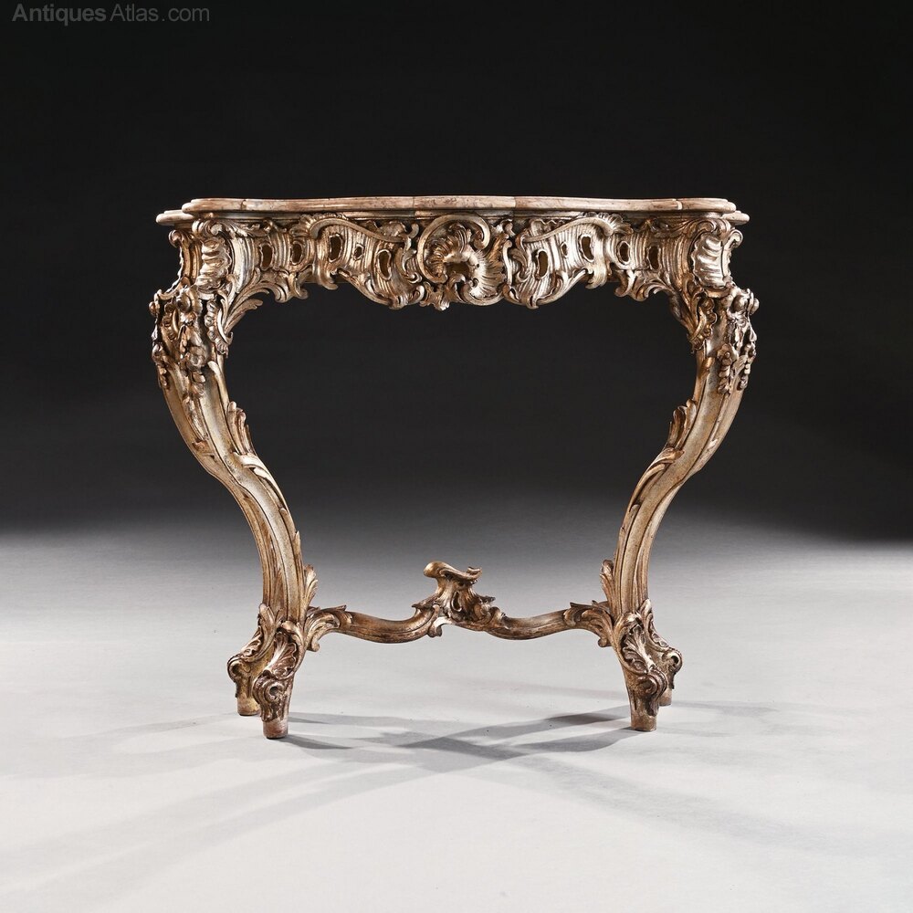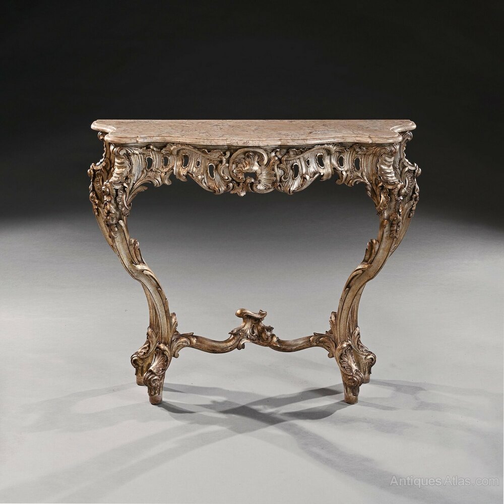 Of sumptuous rococo form, this fine console table centres on an cartouche, surrounded by scroll carving. The combination of foliate detailing and fretted areas is highly attractive, as is the wonderfully playful "cloud-shaped" marble top which is original to the piece.