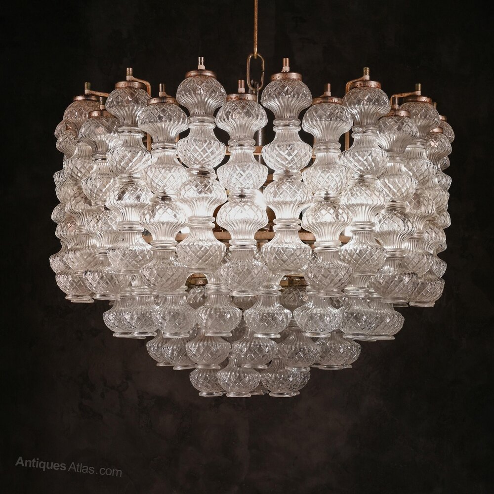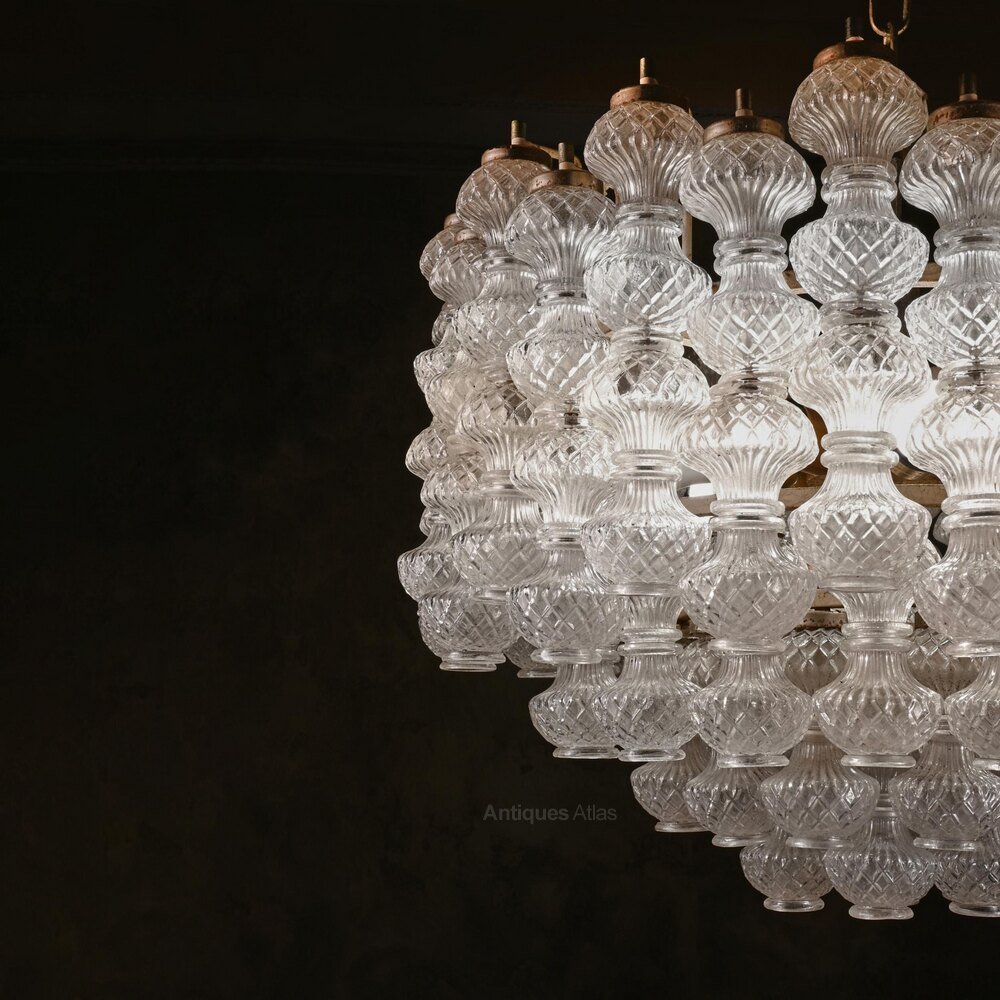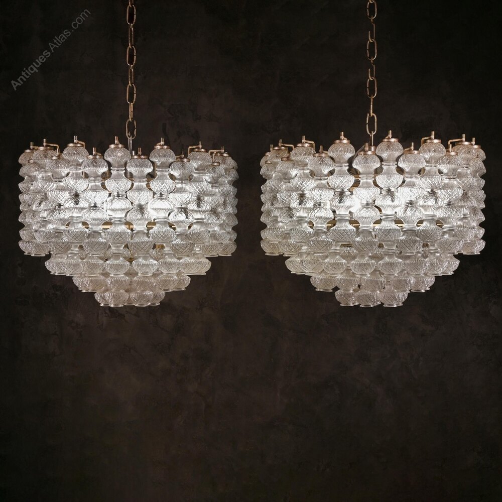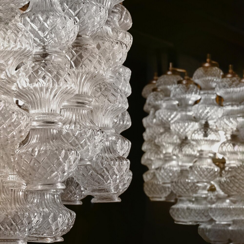 The chandeliers were designed by Flavio Poli, one of the great Italian glass designers of the 20th century. Poli began as a ceramics designer, quickly transferring his energies to glass and appointed as artistic director of what was to become Seguso in 1934. Poli was particularly renowned for his work in the sommerso or submerged glass technique, where glass of one colour was cased inside glass of another, but the present design was produced both in multi-coloured glass of that sort and in traditional crystal. Poli continued to design for Seguso until 1963 and this chandelier design dates from the 50s-early 60s, becoming one of the classic designs of that period. Indeed so enduring is the design that the Murano glass manufacturers still produce modern versions of this design today.