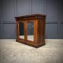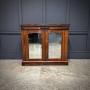 The cabinet is fronted by a pair of elegant mirrored doors, each set within finely moulded frames. The doors open smoothly to reveal a clean interior fitted with 2 height-adjustable shelves, offering both practicality and versatility for displaying or storing a range of items. A working lock and original key are present, providing a secure closure.